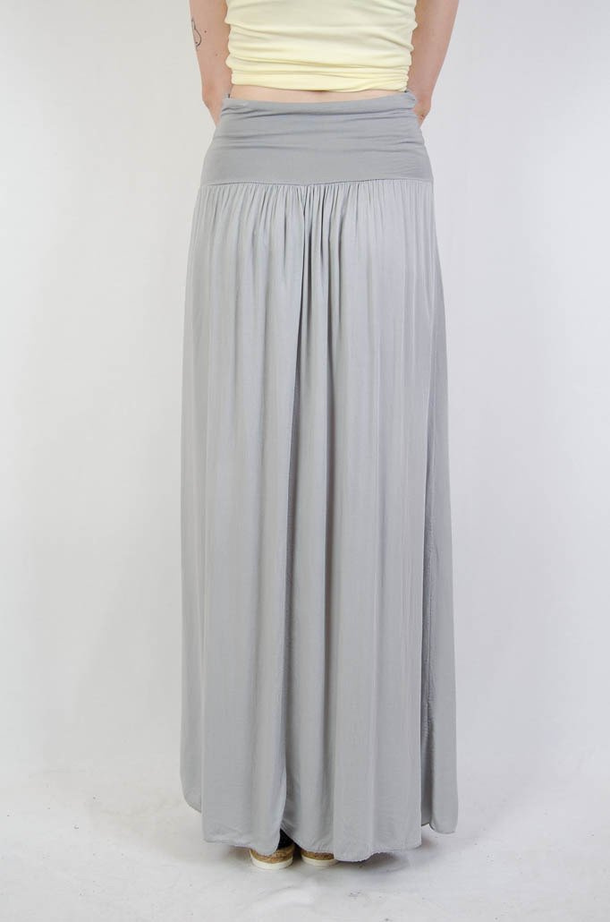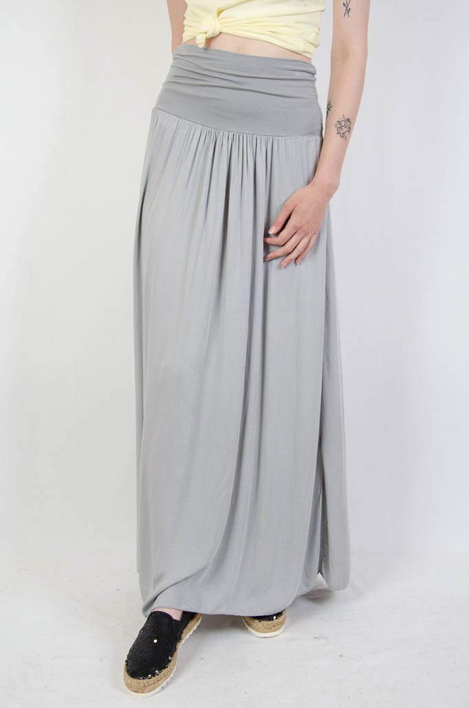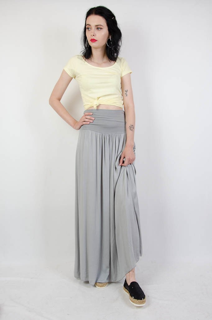Długa zwiewna szara spódnica z szerokim pasem