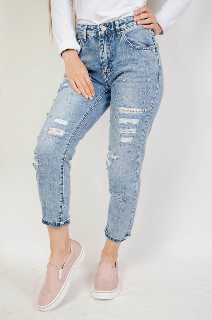 SPODNIE JEANSOWE TYPU BOYFRIEND Z CYRKONIAMI