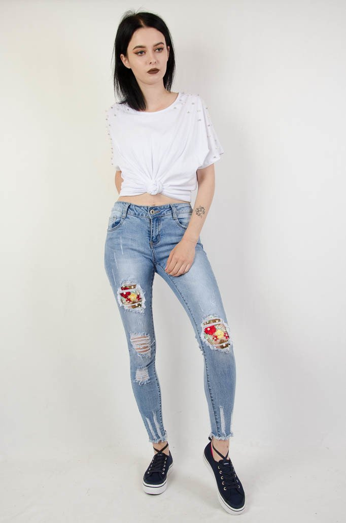 SPODNIE JEANSOWE Z KWIATOWYM HAFTEM
