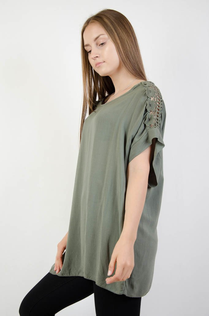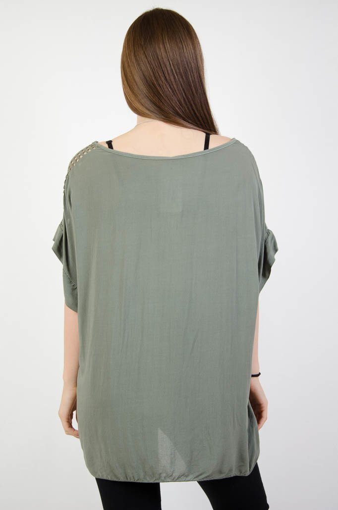 Zielona bluzka oversize z ażurowymi wstawkami na ramionach