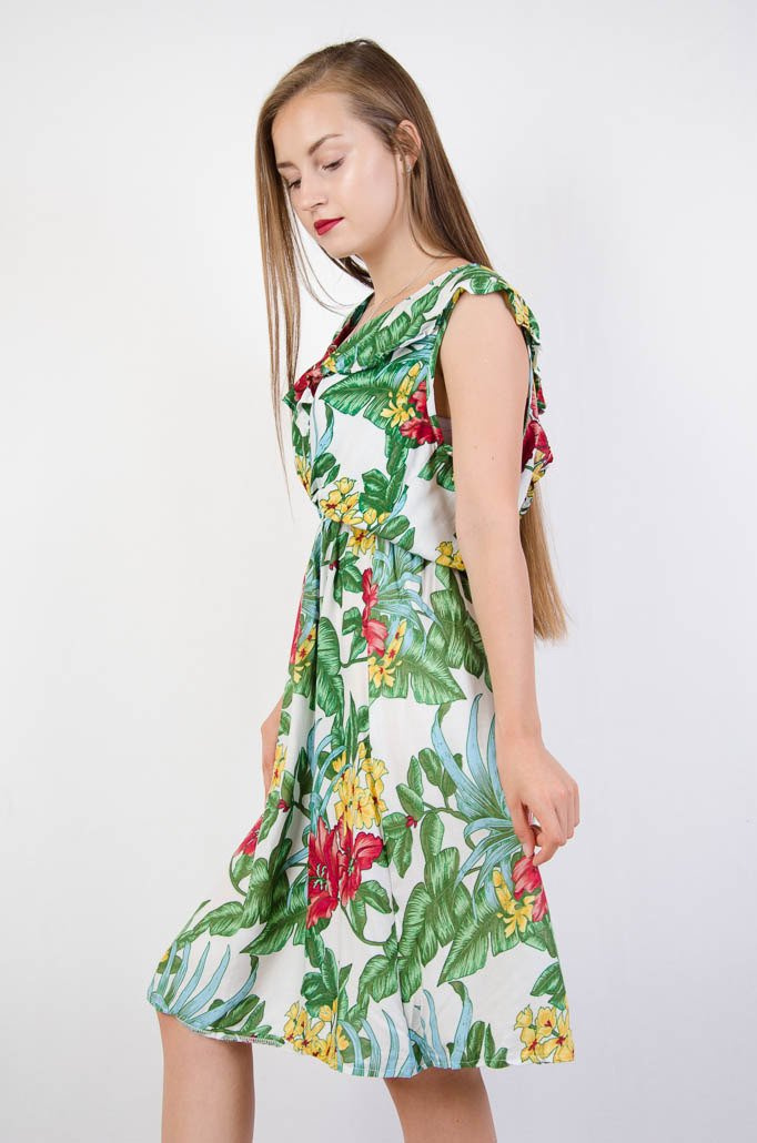 Biała kwiecista sukienka z falbaną w dekolcie