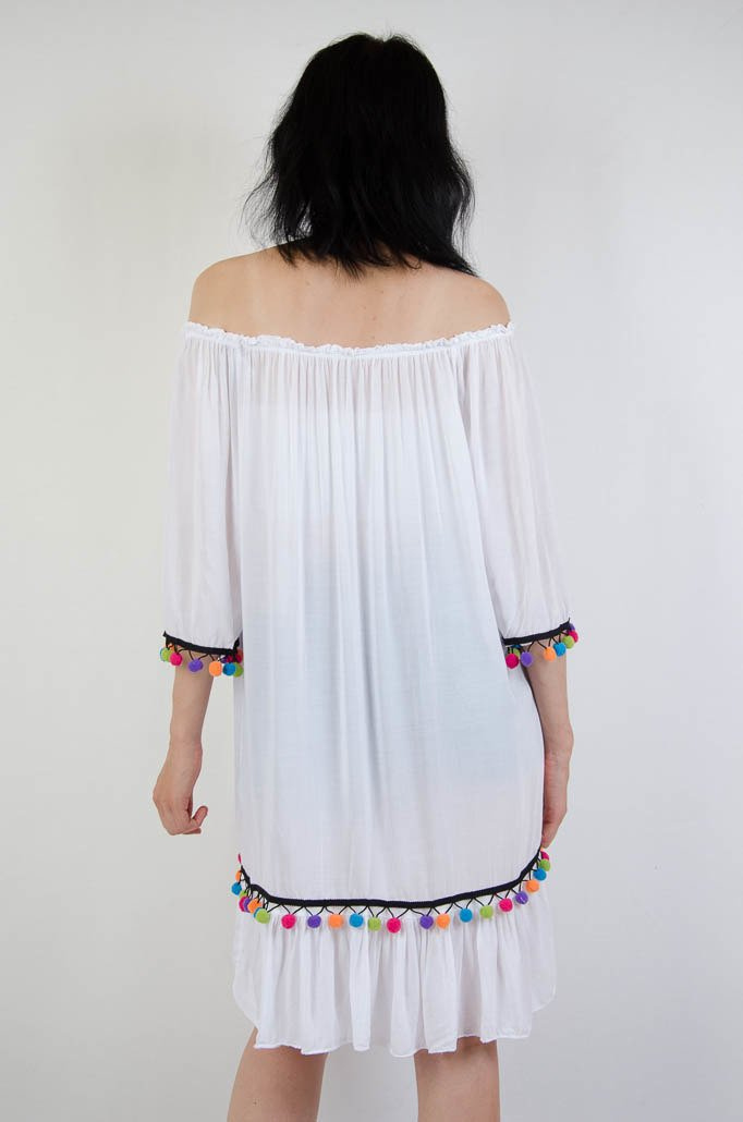 BIAŁA TUNIKA Z KOLOROWYMI POMPONIKAMI