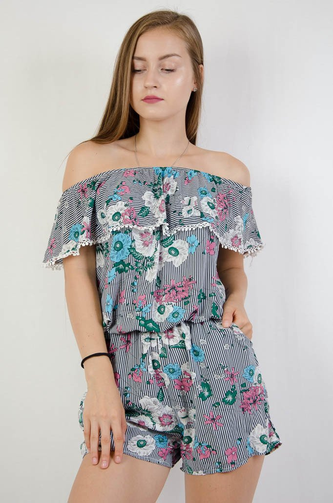 BIAŁY KOMBINEZON W CZARNE PASKI Z KWIATAMI