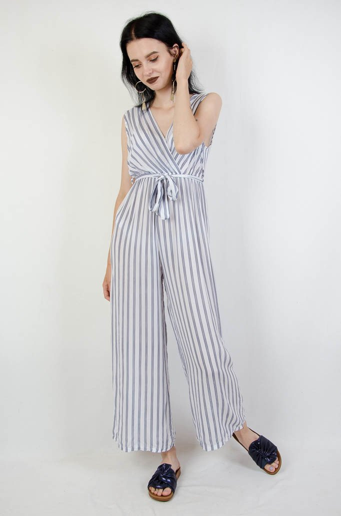KOMBINEZON W BIAŁO GRANATOWE PASY Z ROZRZEDZANYMI NOGAWKAMI
