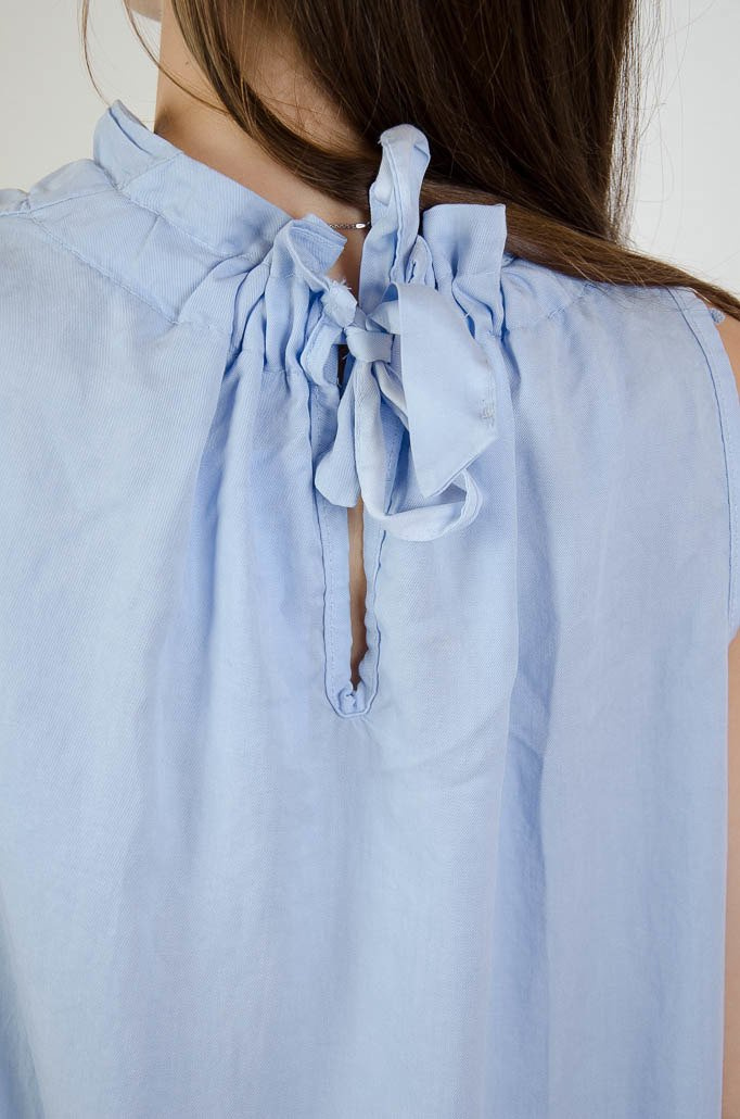 NIEBIESKA BLUZKA BEZ RĘKAWÓW Z MARSZCZENIEM PRZY SZYI