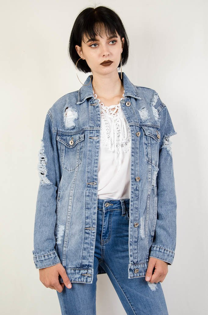 Kurtka jeansowa dłuższa z licznymi przetarciami