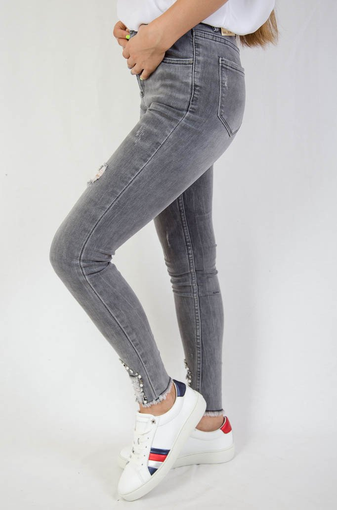 Jasnoszare spodnie jeansowe z przetarciami oraz koralikami