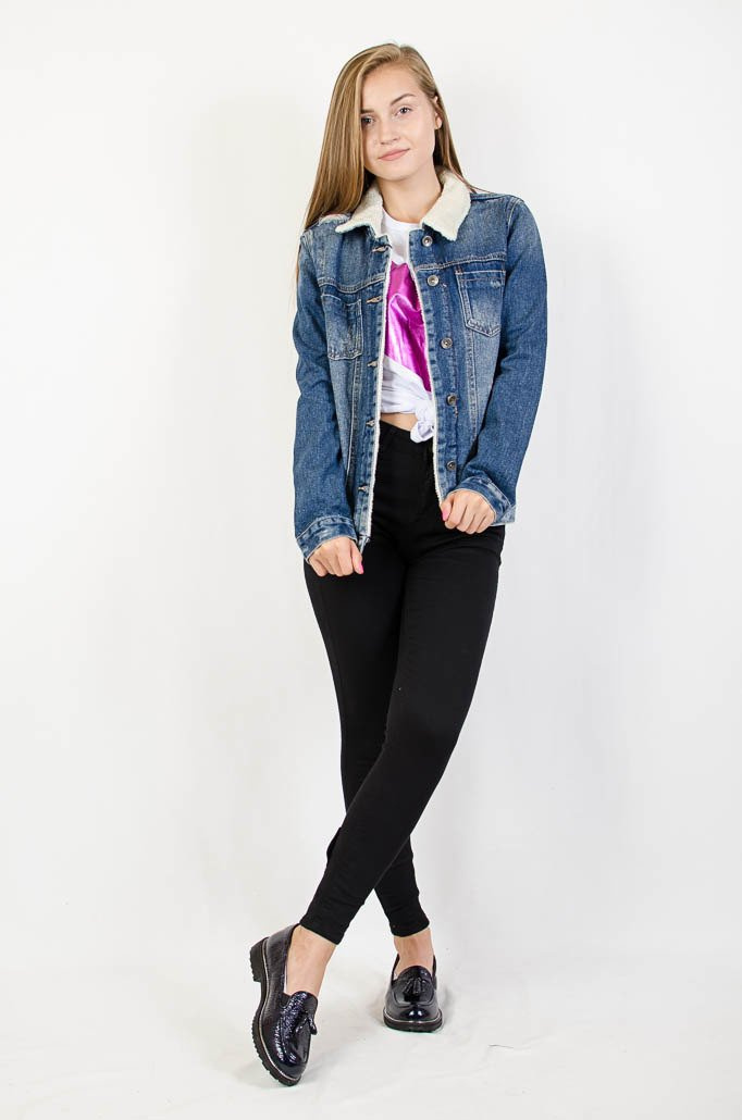 Ciemna kurtka jeansowa z kożuchem na kołnierzu oraz przy guzikach