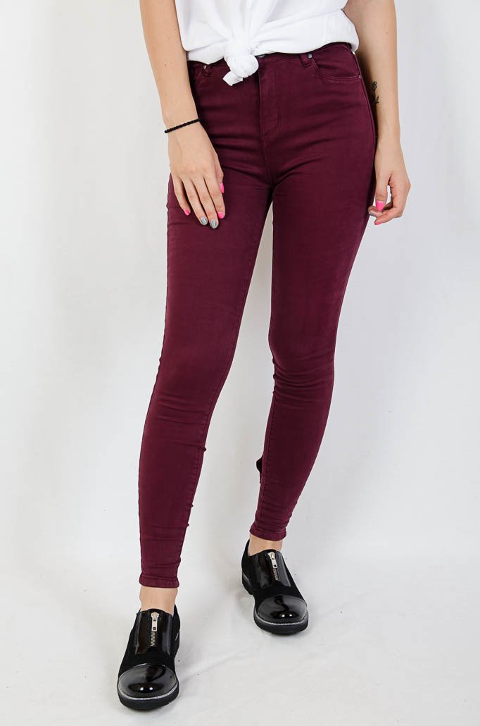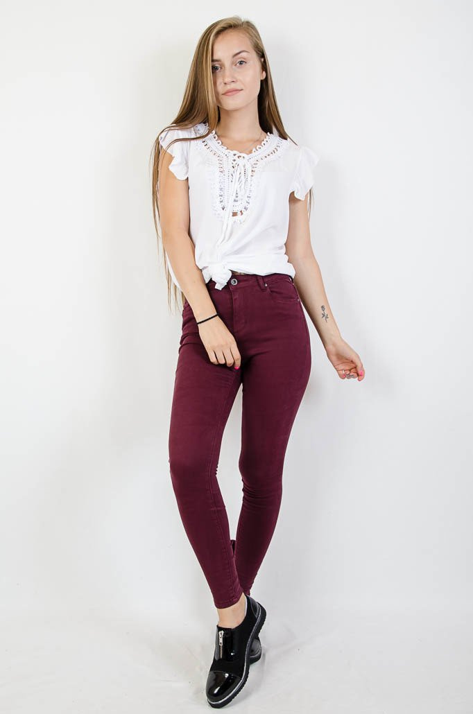 Bordowe spodnie jeansowe z zamkiem na nogawce oraz kokardą