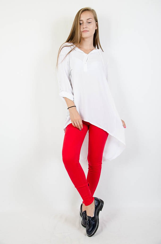 Biała asymetryczna bluzka z kapturem oraz napisami