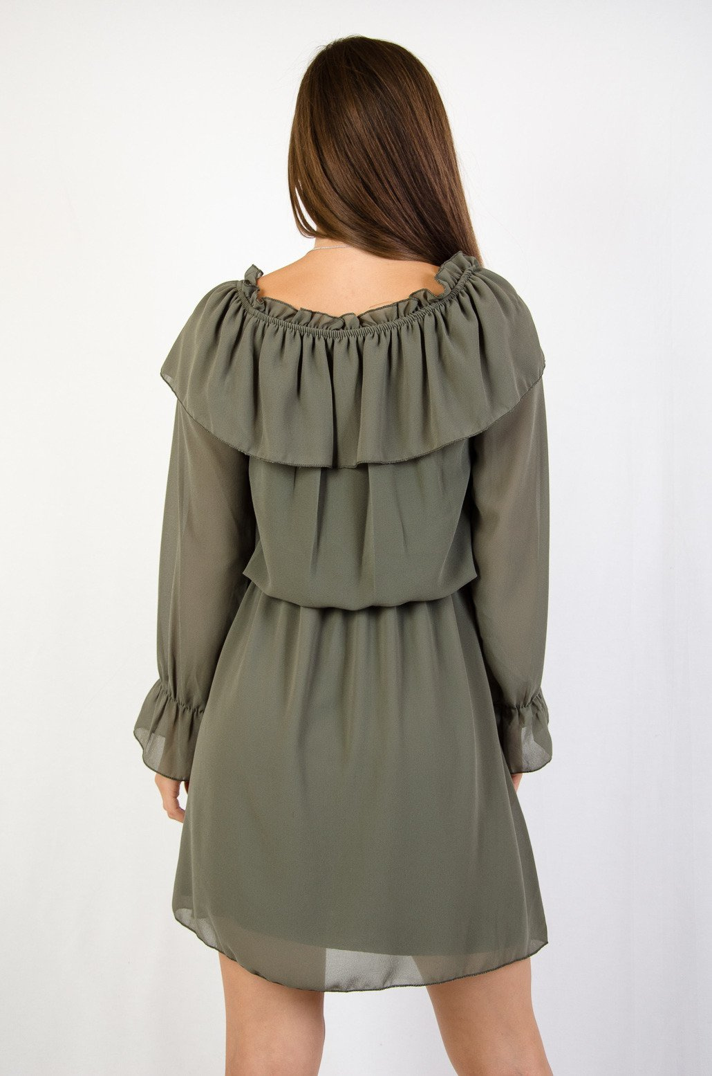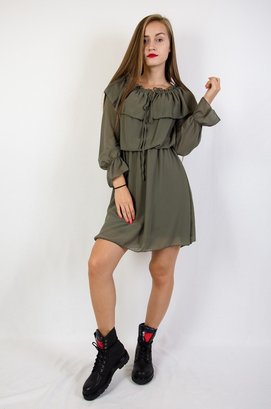 Zielona sukienka na długi rękaw z gumą w dekolcie, z falbanką na górze.