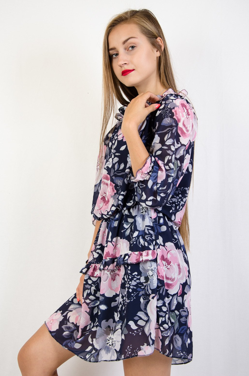 Granatowa sukienka w różowe kwiaty z gumką w pasie i wiązaniem przy dekolcie. Posiada również falbanki na końcu rękawów oraz na dekolcie.
