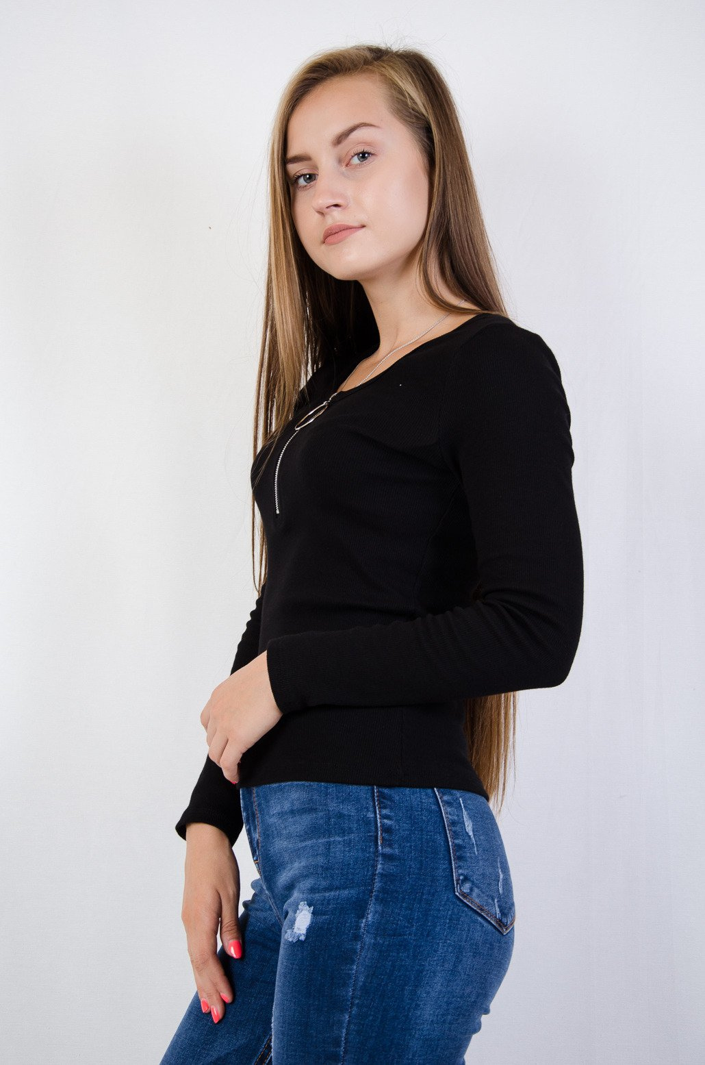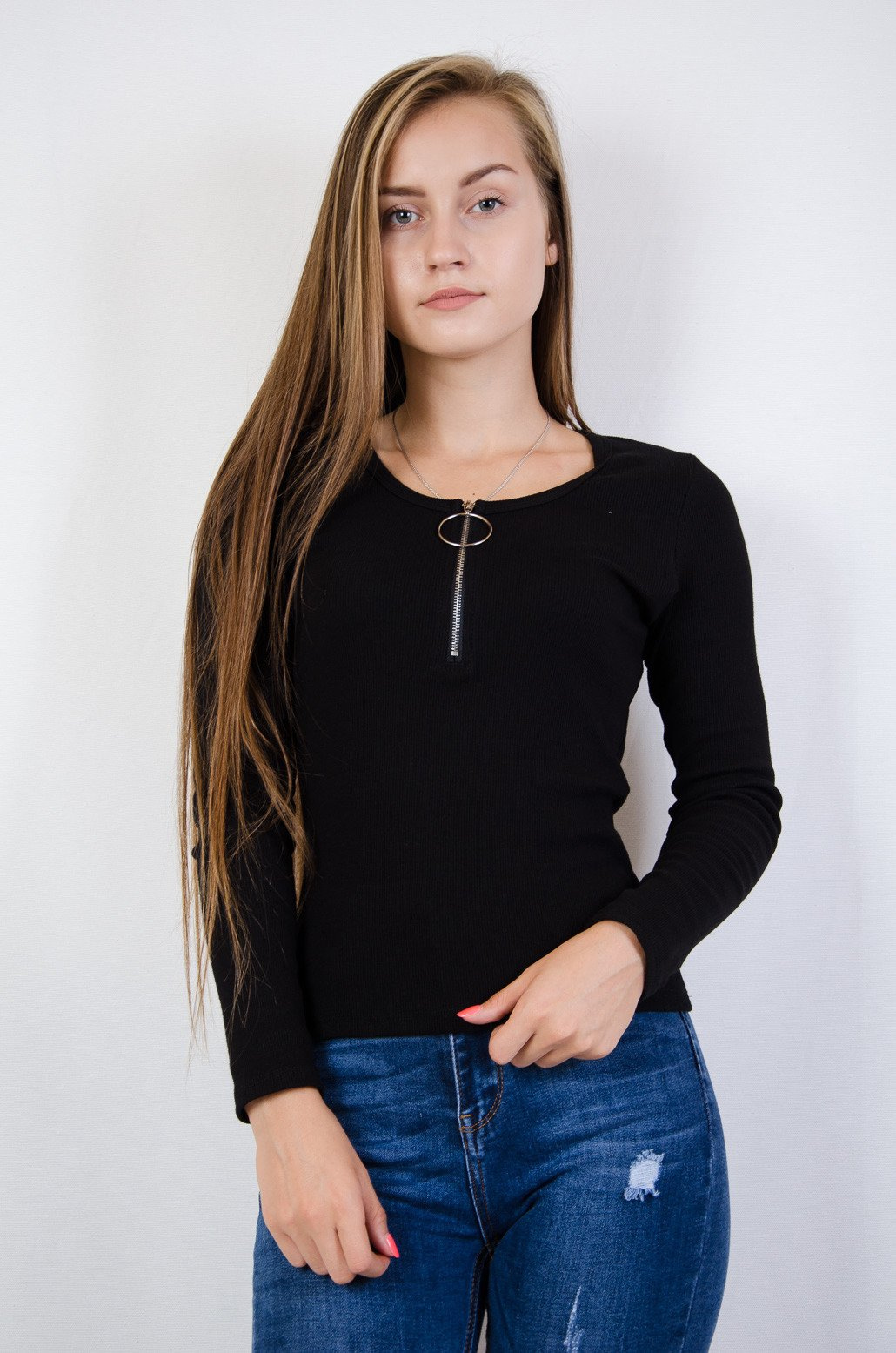 Czarna dopasowana bluzka z zamkiem w dekolcie oraz ozdobnym kółkiem
