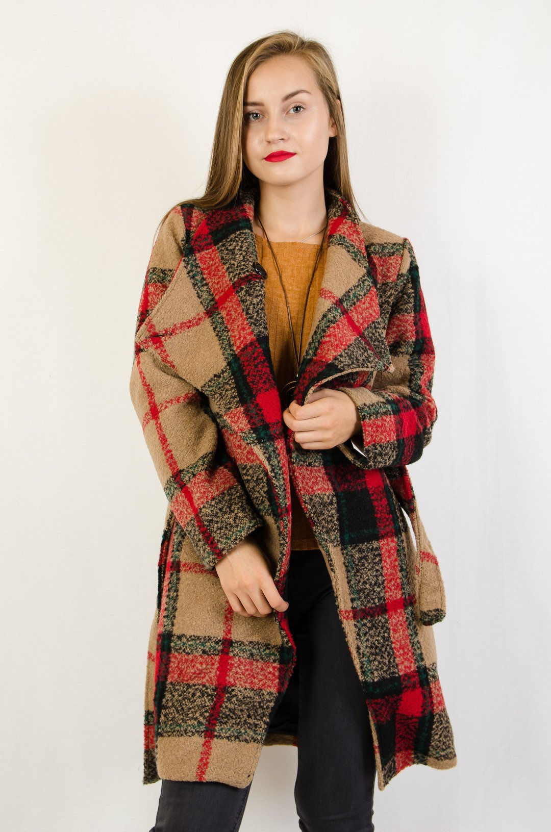 Beżowy płaszcz w kratę, z wiązaniem w pasie oraz guzikiem przy szyi