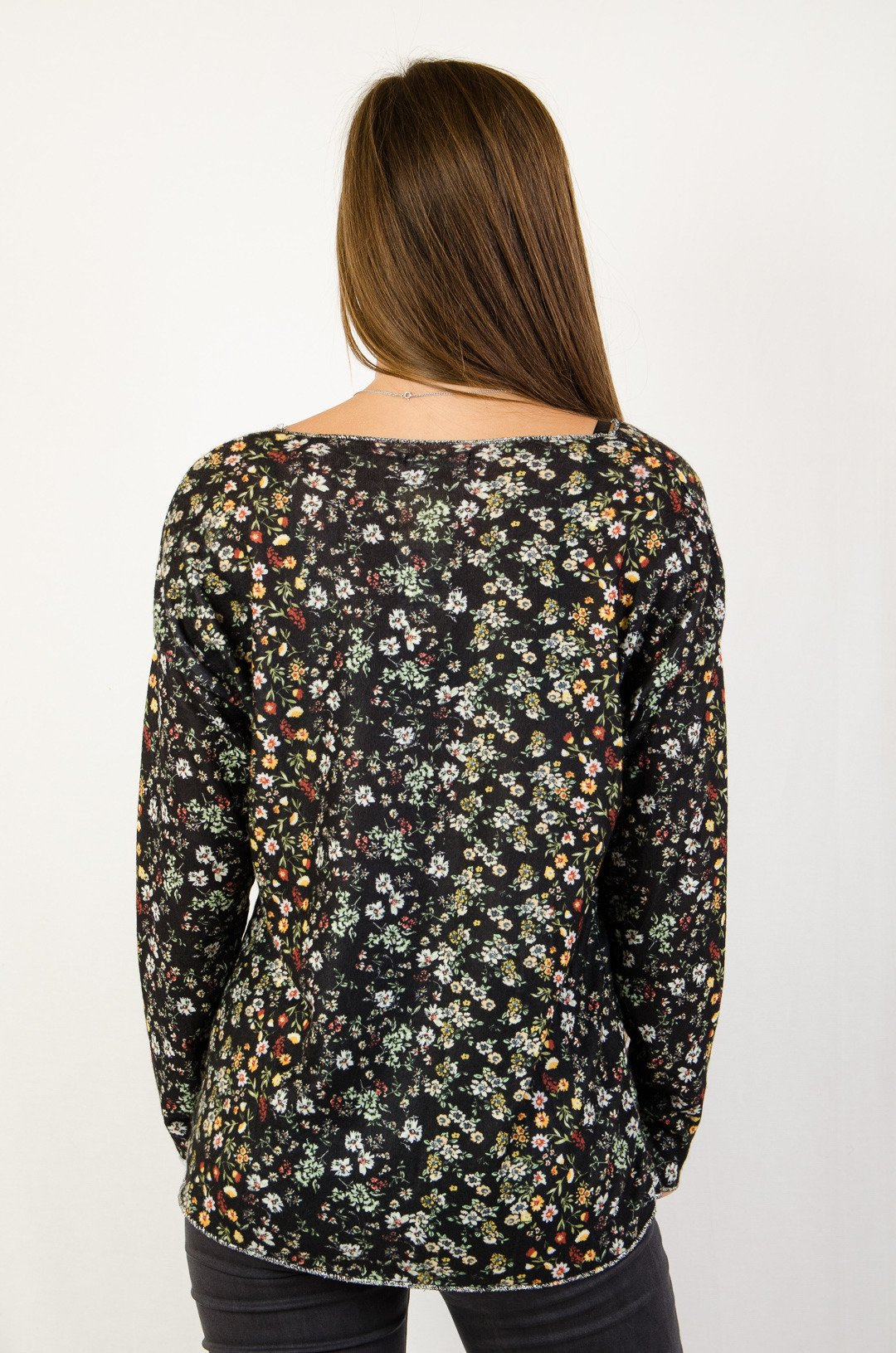 Czarna bluzka w drobne kwiatki.
