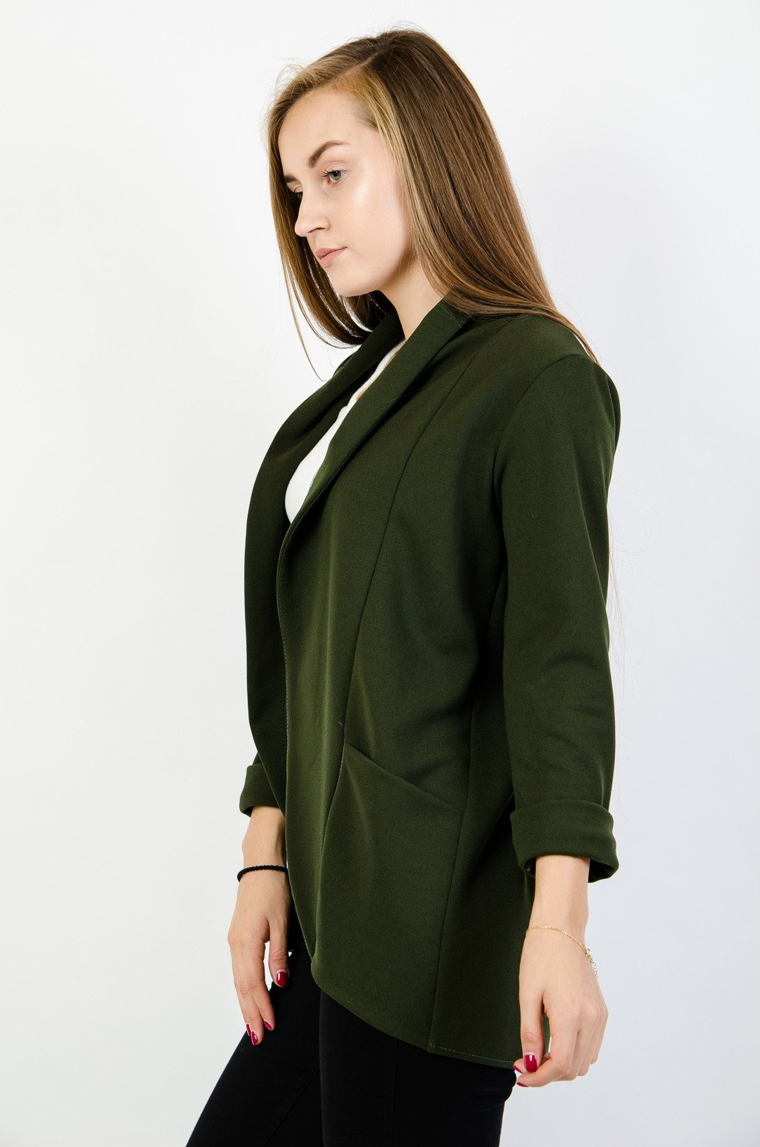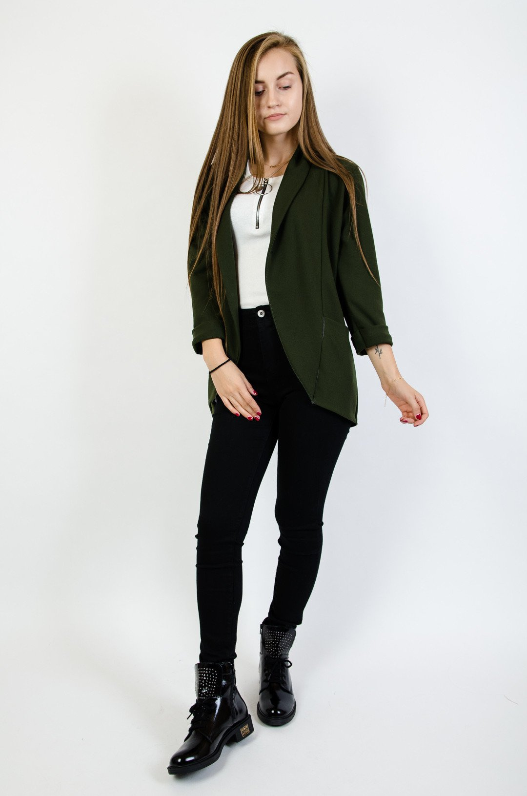 Zielona narzuta-marynarka z zakładką, podwinięte rękawy