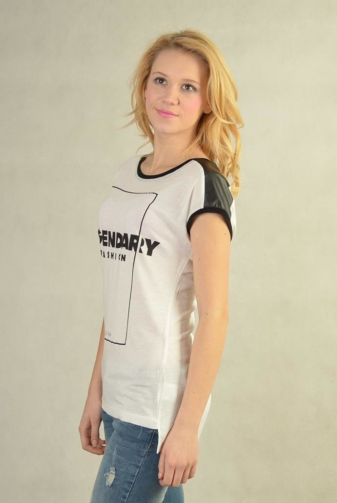Stylowa bluzka na krótki rękaw. Na ramionach skóra ekologiczna. Z przodu napis LEGENDARY FASHION. świetnie sprawdzi się w codziennych stylizacjach.