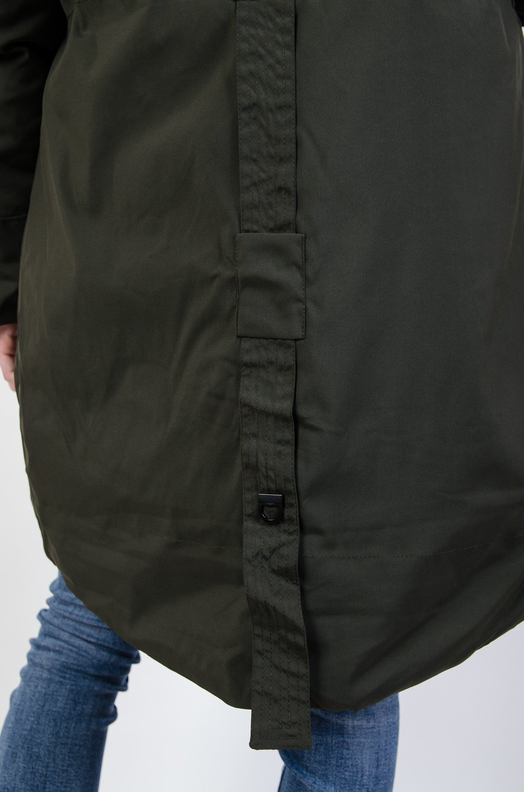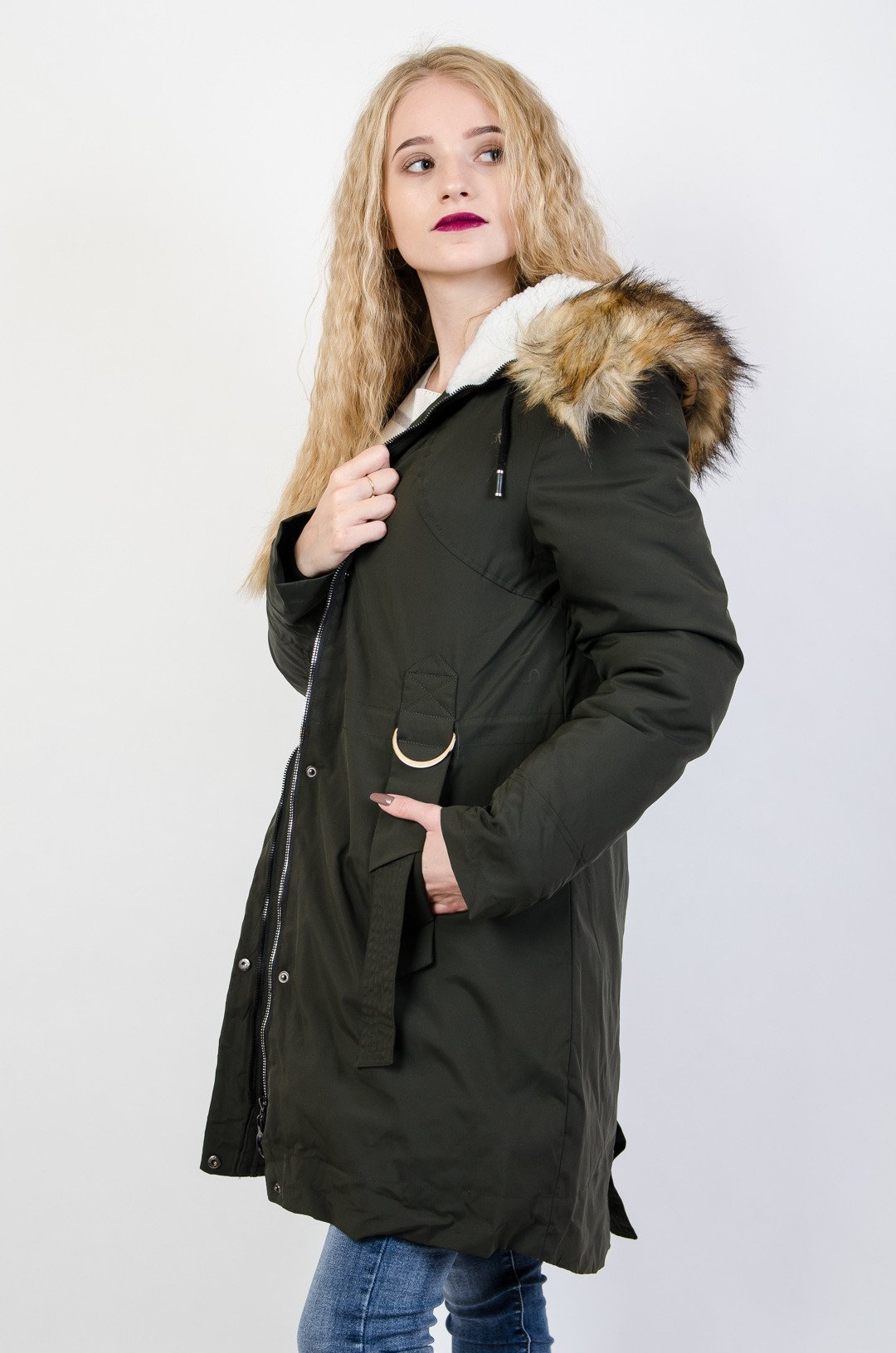 Zielona kurtka ocieplana ze ściągaczem w tali. Możliwe jest odpięcie futerka przy kapturze.
