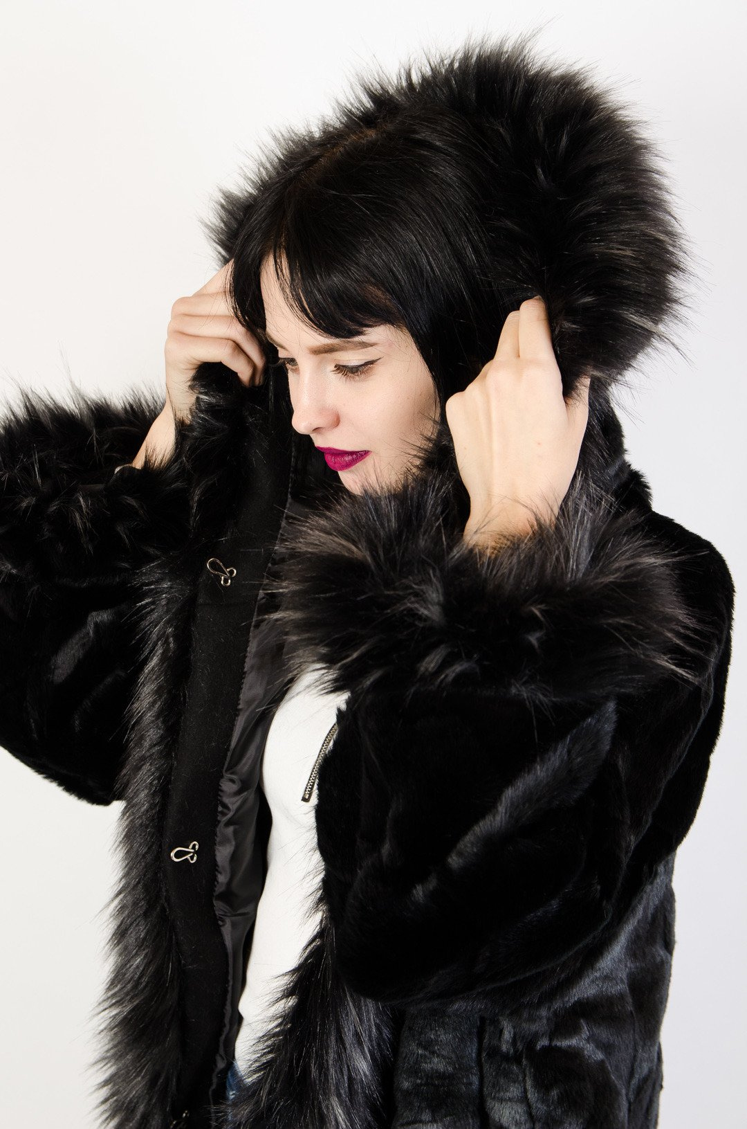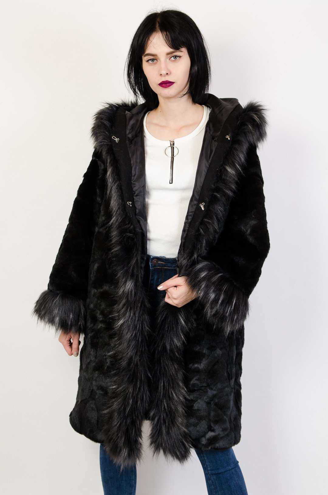 Czarne sztuczne futro z kapturem.