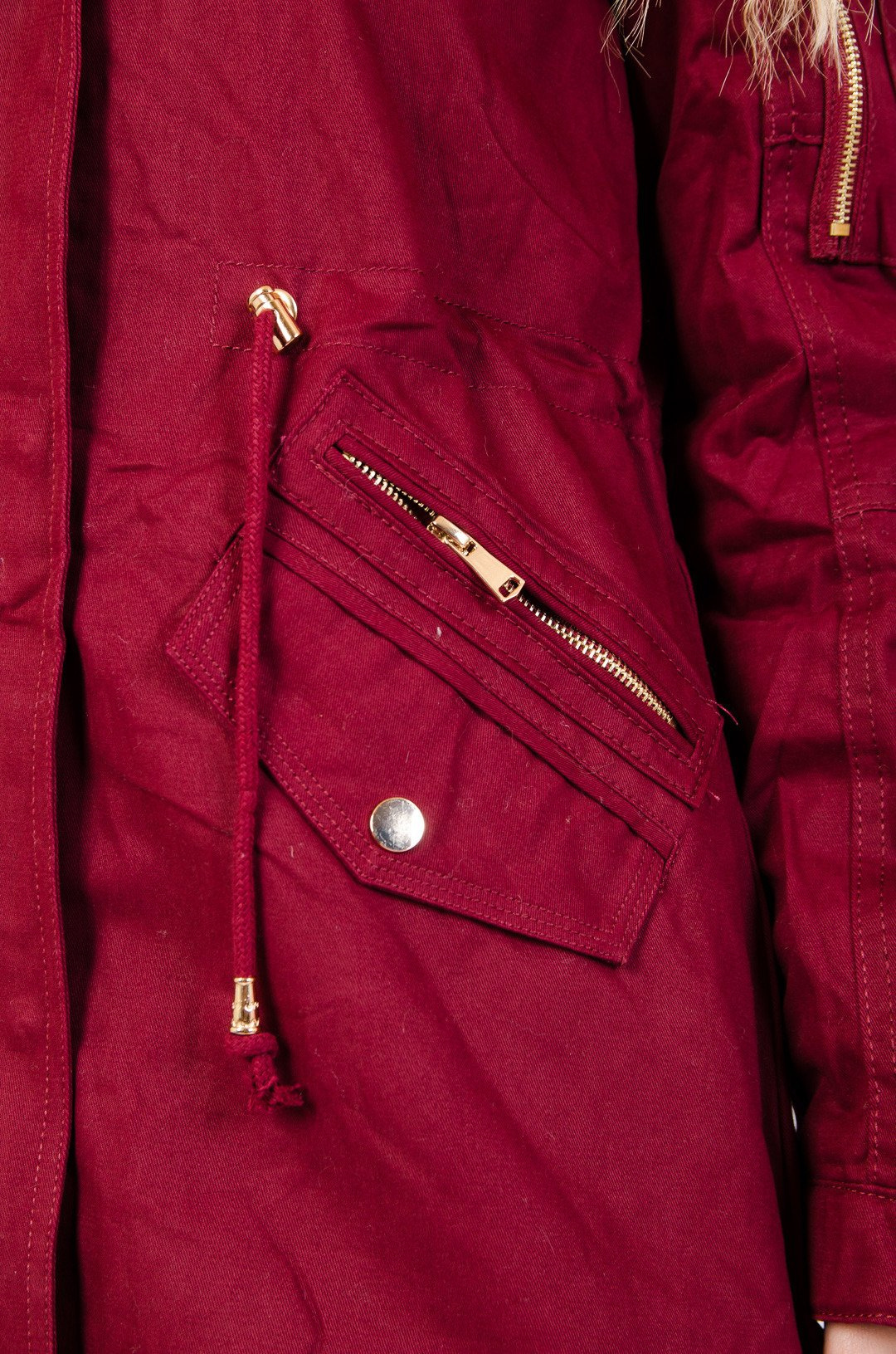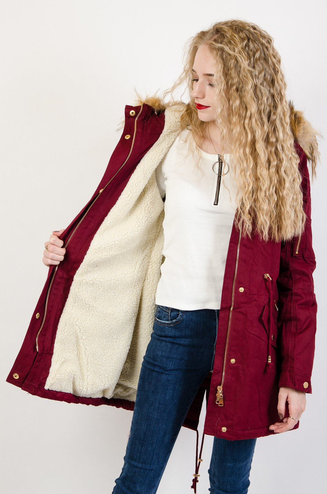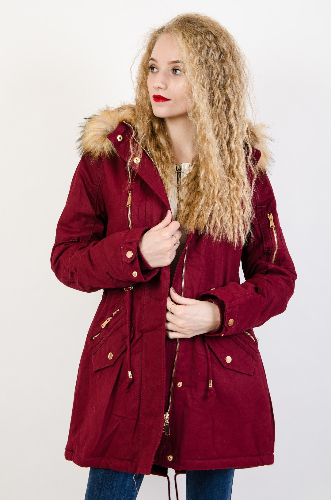 Bordowa asymetryczna kurtka ze złotymi zamkami