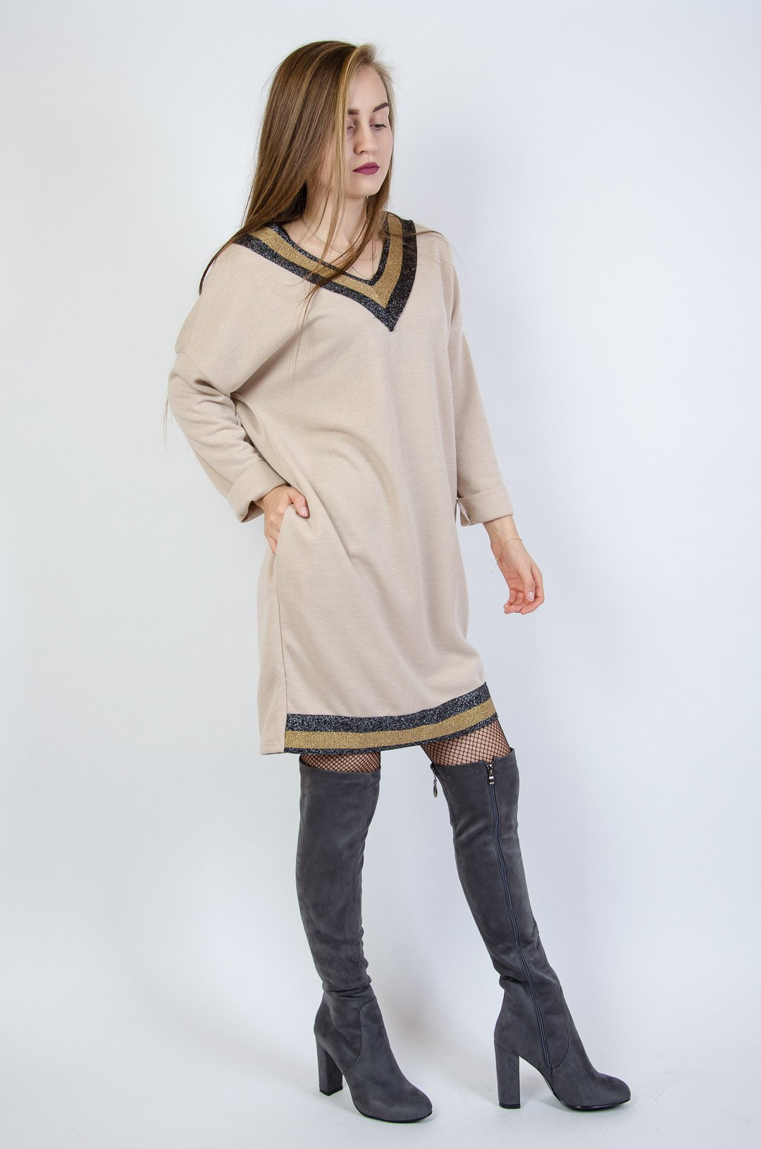 Beżowa dzianinowa sukienka z dekoltem w serek .