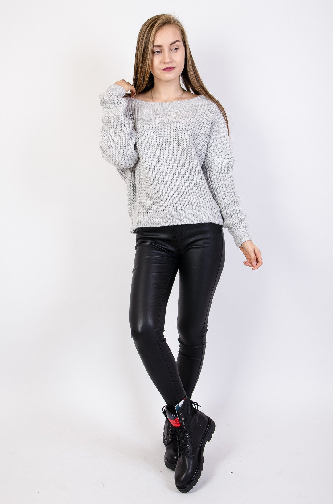 Szary sweter typu nietoperz  wiązany na plecach wstążkami