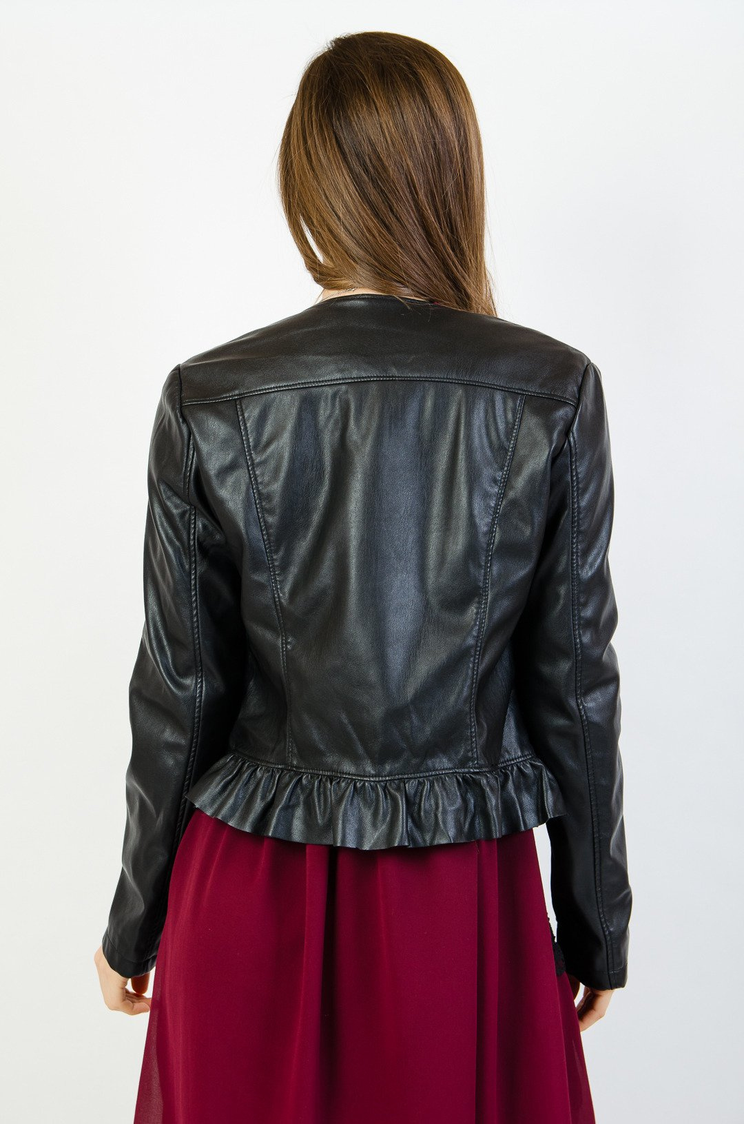 Czarna ramoneska z falbaną na dole.