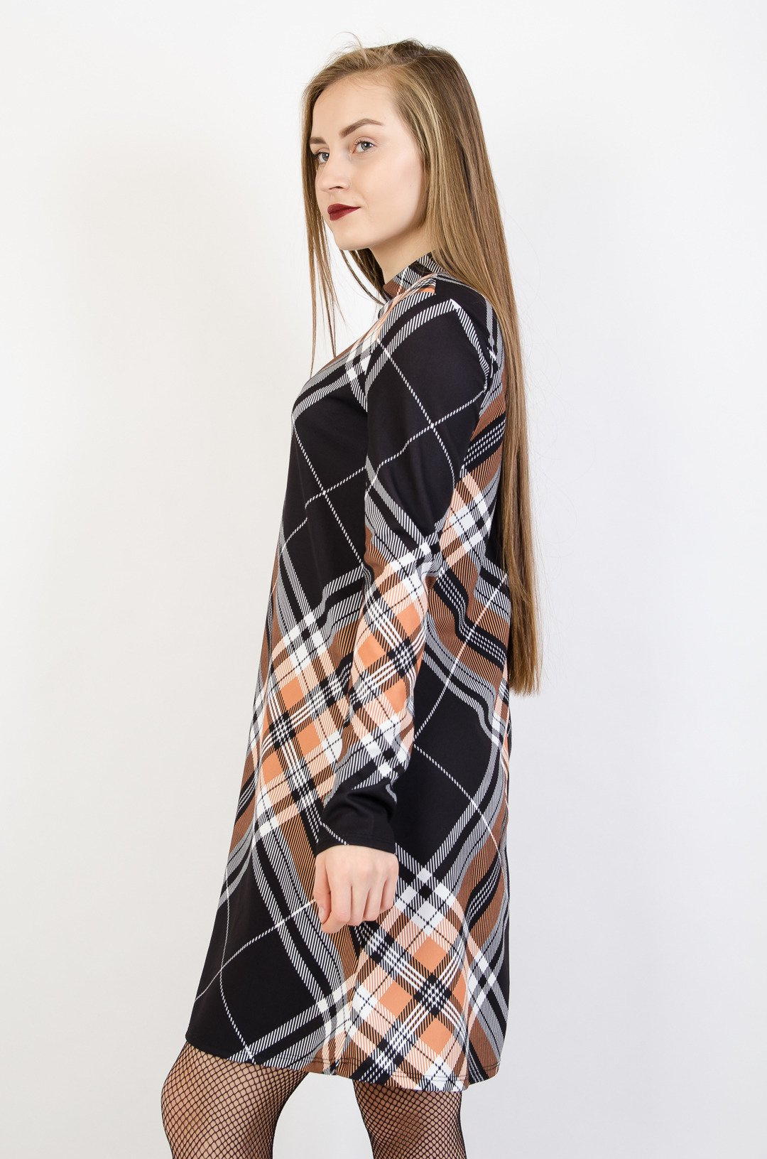 Prosta sukienka w czarno-brązową kratę z długim rękawem.