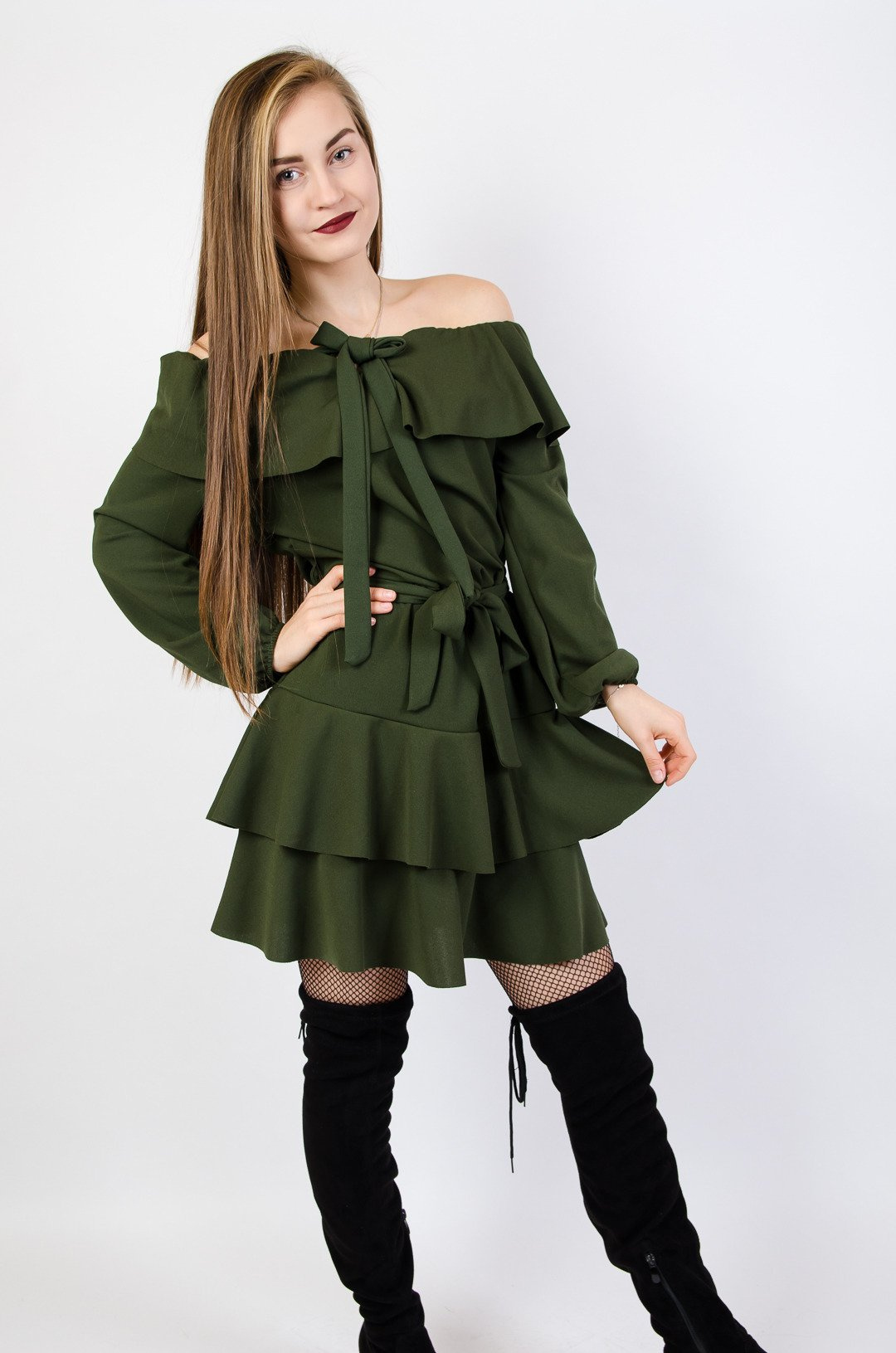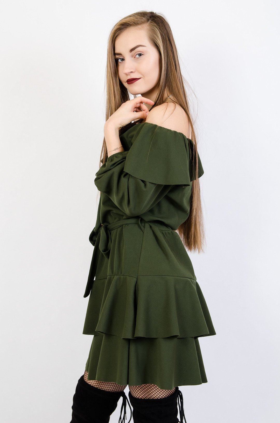 Zielona rozkloszowana sukienka z hiszpańskim dekoltem,