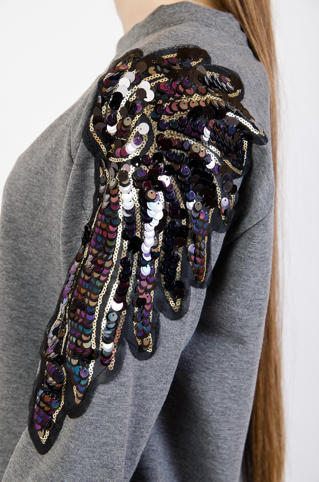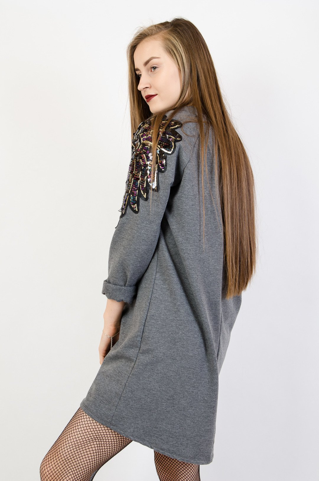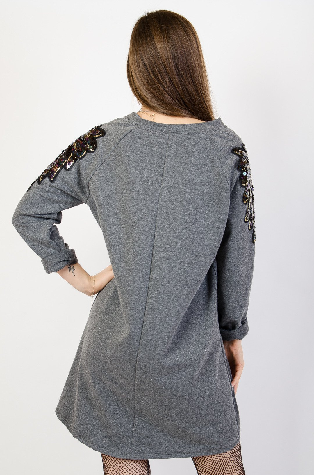 Szara sukienka oversize z ozdobnymi ramionami