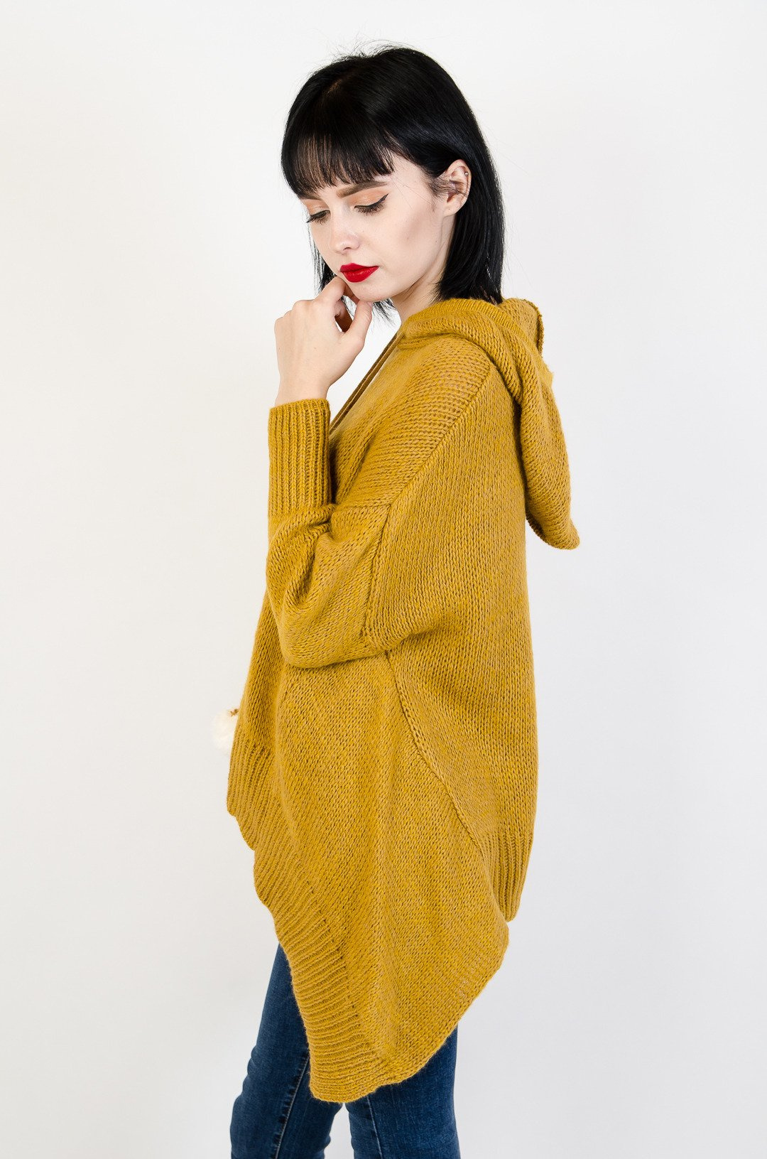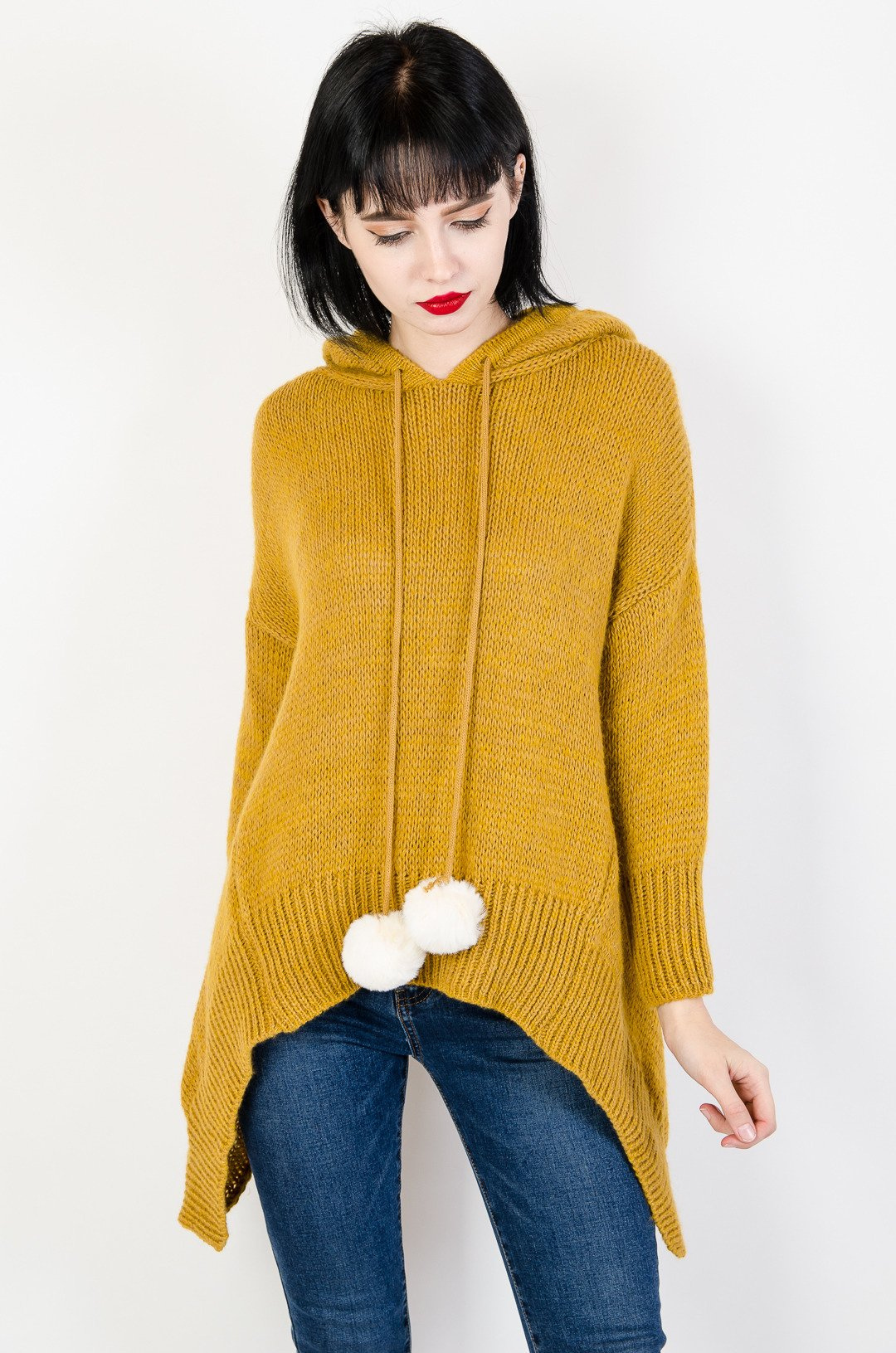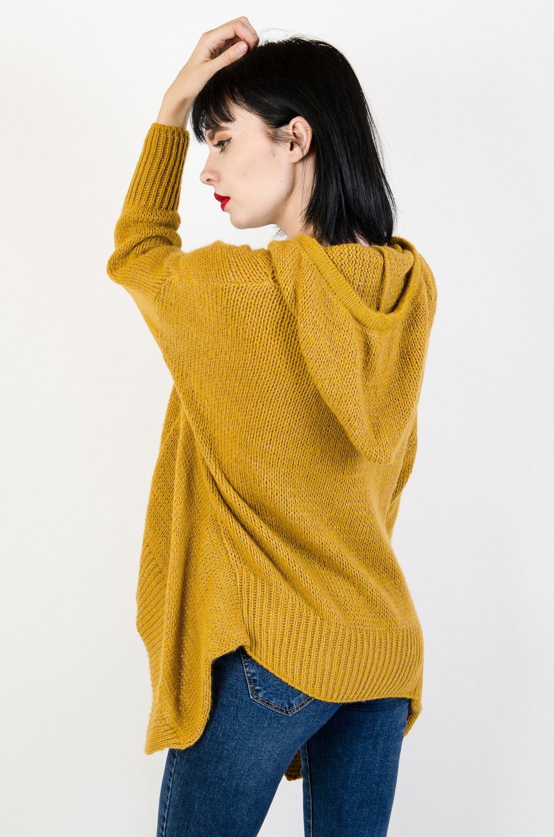 Musztardowy sweter z dłuższymi bokami oraz kapturem.