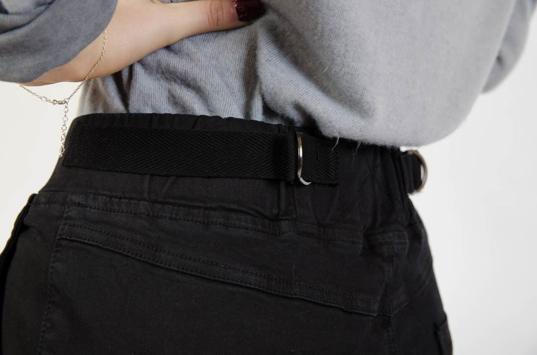 Czarne spodnie jeansowe z gumą w pasie oraz marszczeniem na kolanach