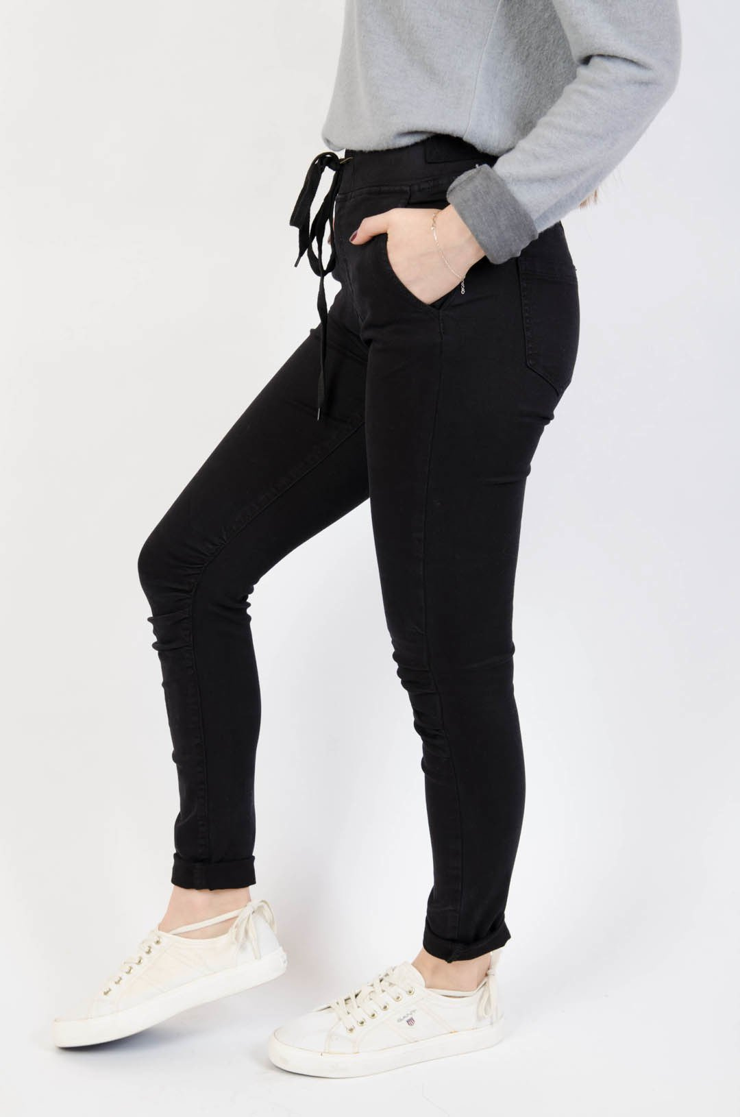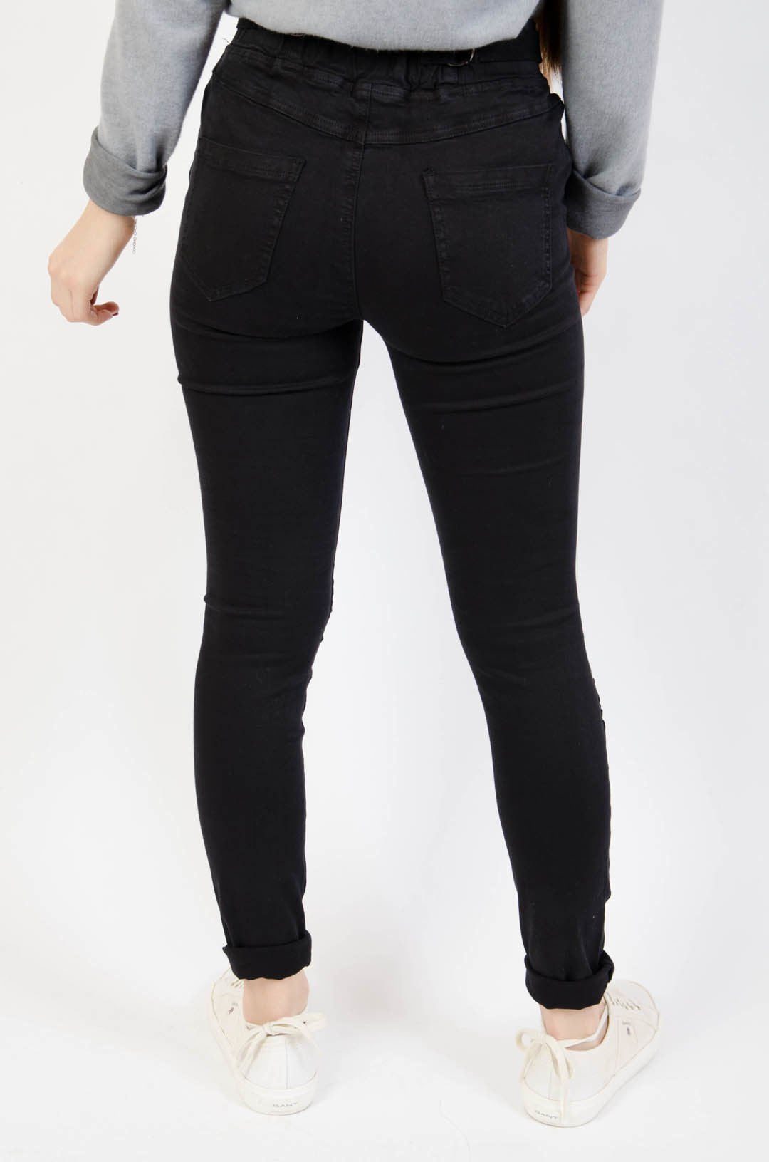 Czarne spodnie jeansowe z gumą w pasie oraz marszczeniem na kolanach.