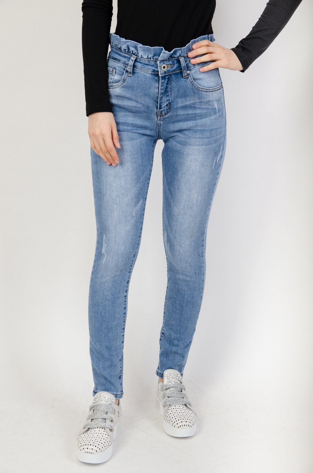 Jasne spodnie z wysokim stanem i falbanką w pasie