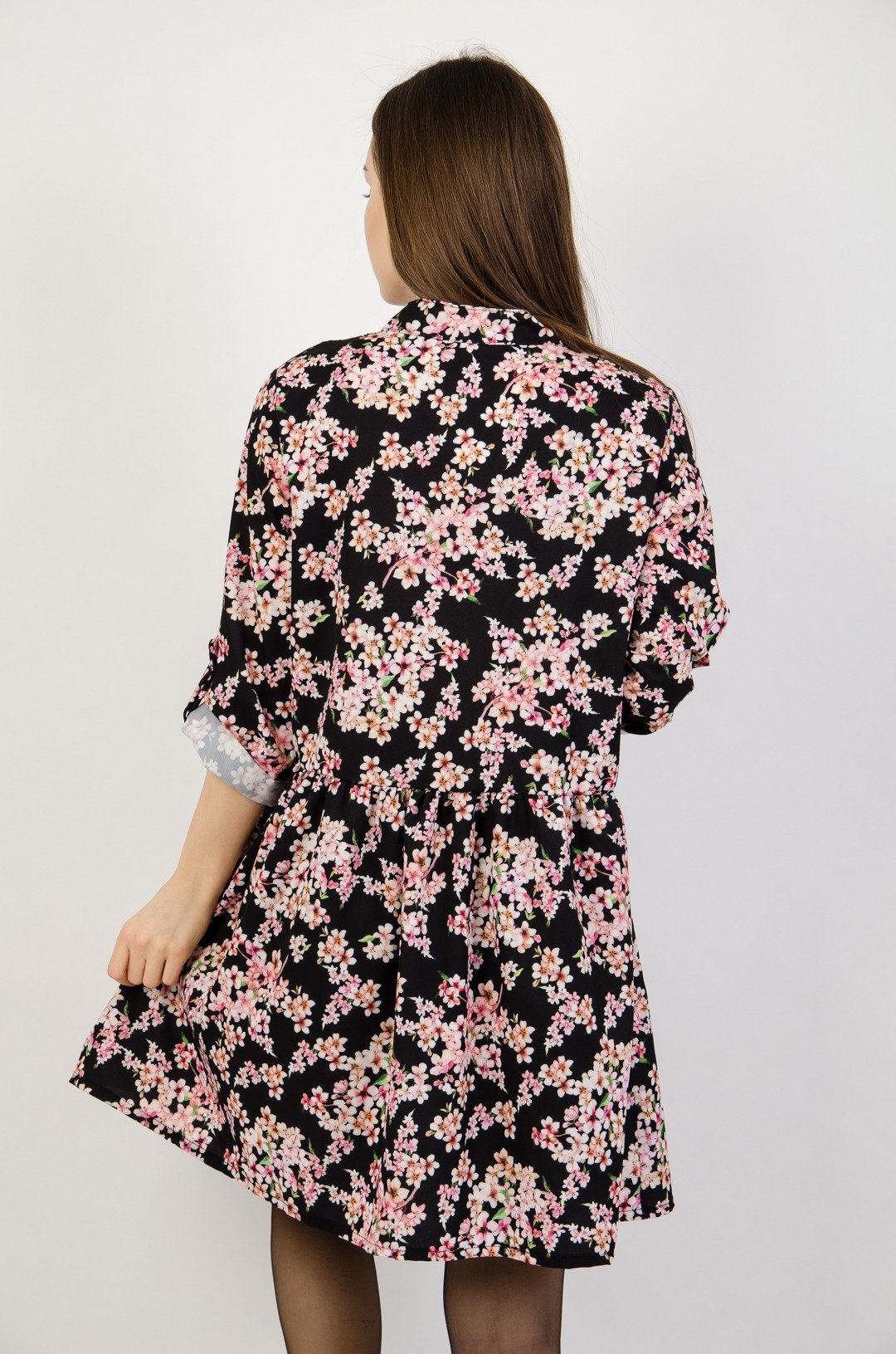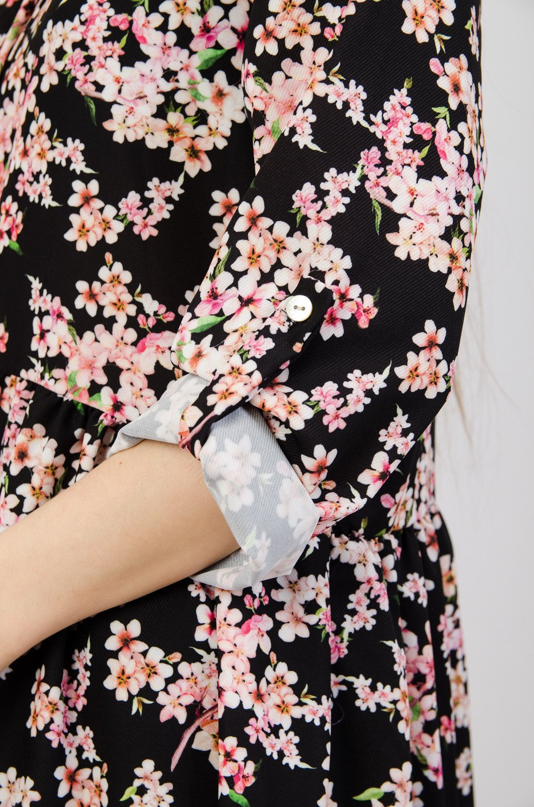 Czarna sukienka w drobne różowe kwiaty, zapinana na guziki