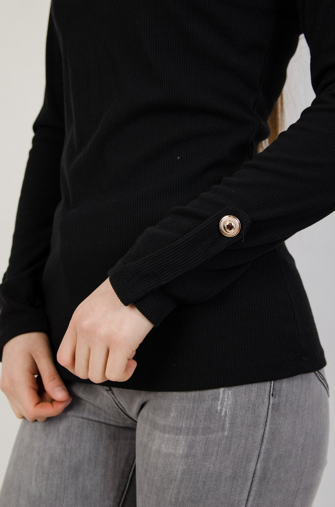 Czarna prążkowana bluzka z guzikami przy dekolcie.