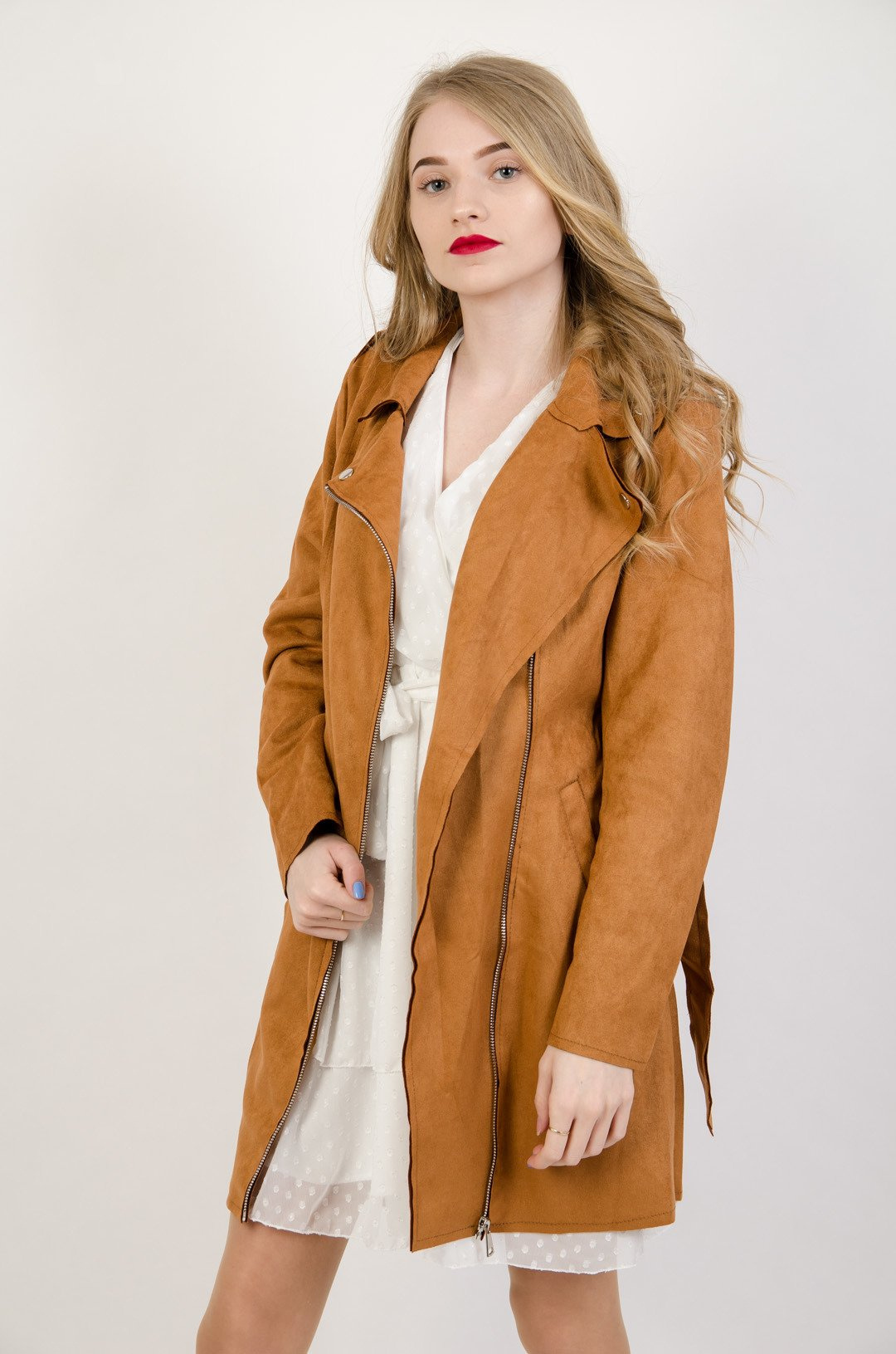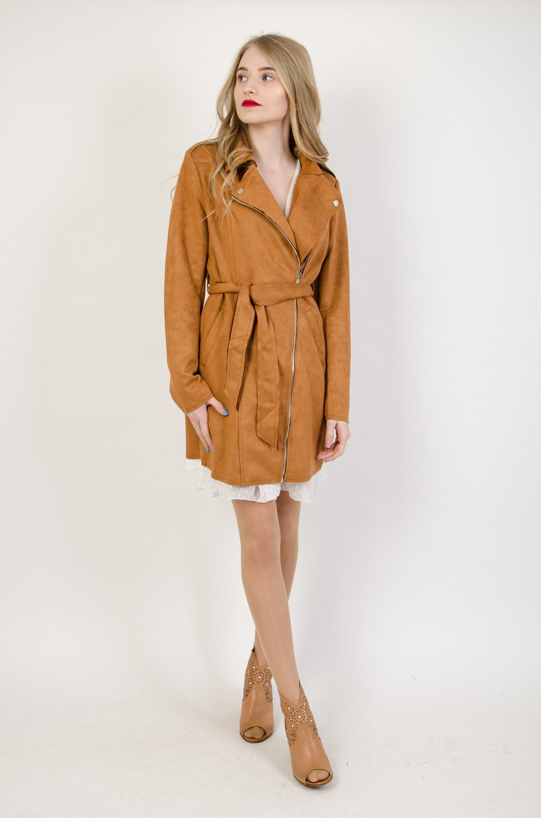 Brązowy zamszowy płaszcz z zamkiem z boku oraz paskiem.