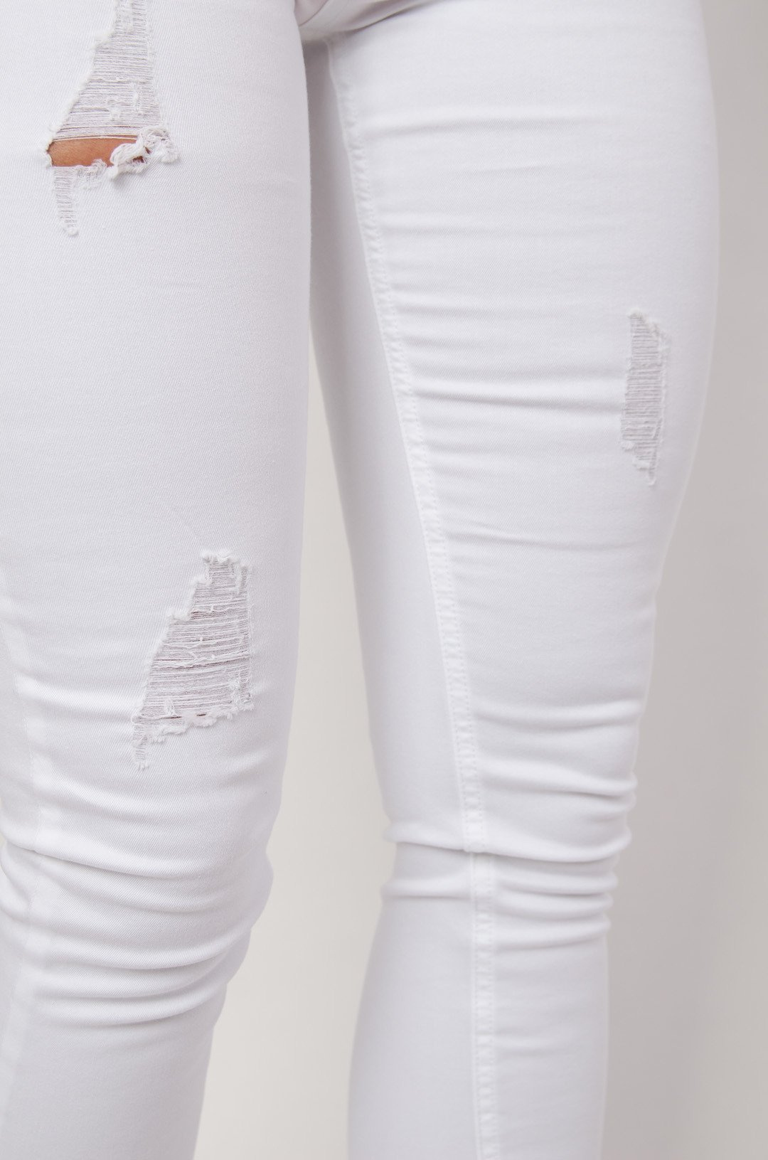 Białe spodnie jeansowe z przetarciami zapinane na guziki.