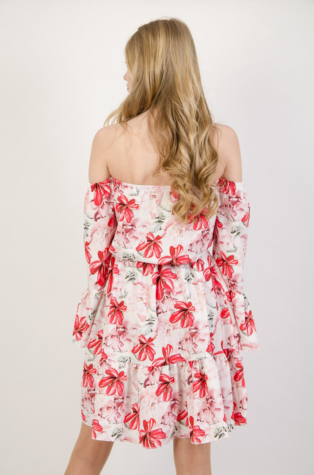 Biała sukienka w czerwone kwiaty z odkrytymi ramionami.