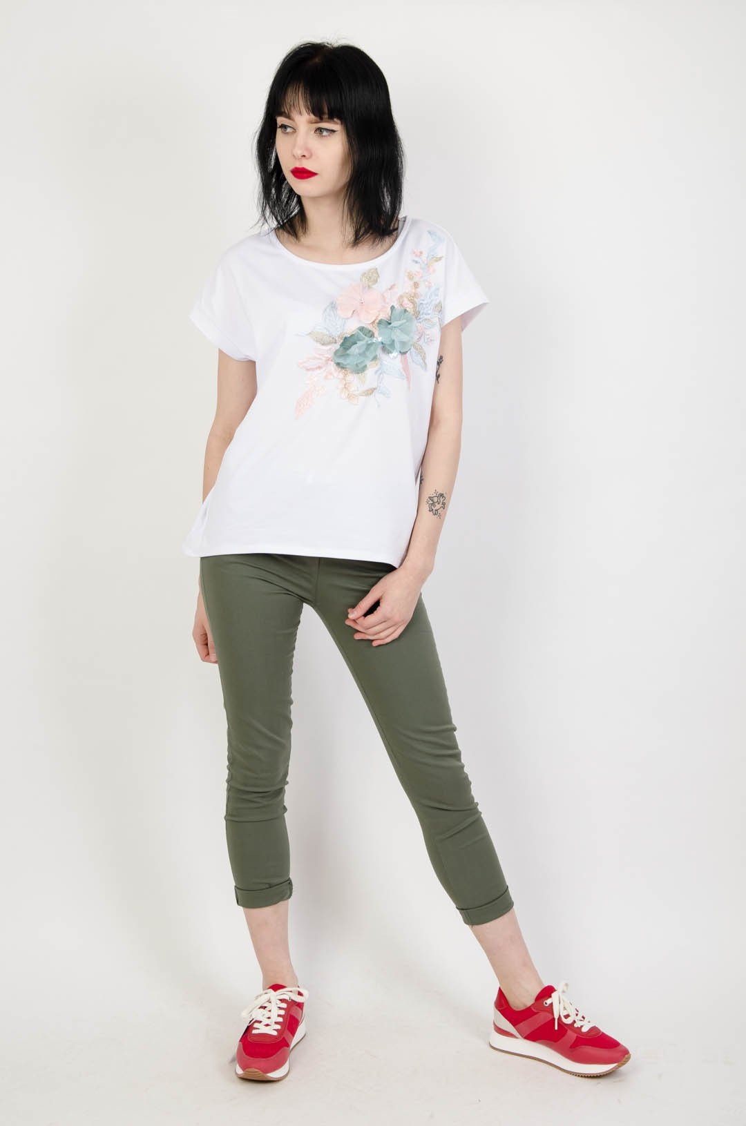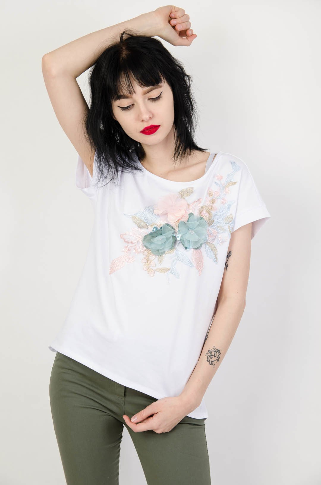 Biała bluzka z kwiatową aplikacją