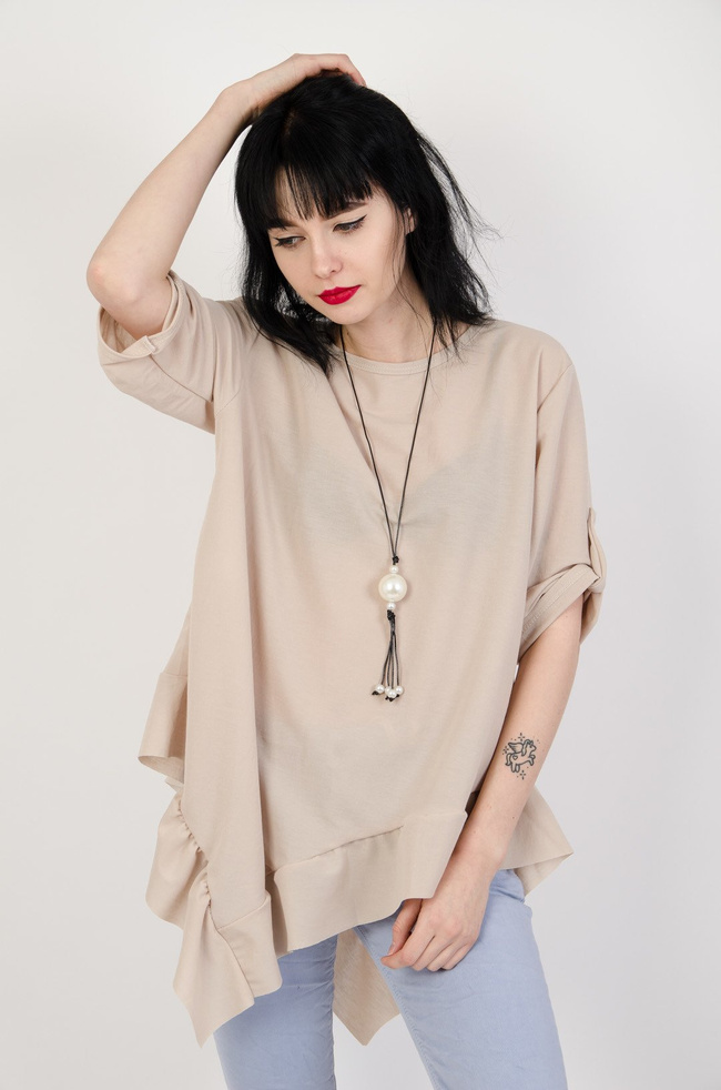 Beżowa asymetryczna bluzka z falbaną + wisiorek