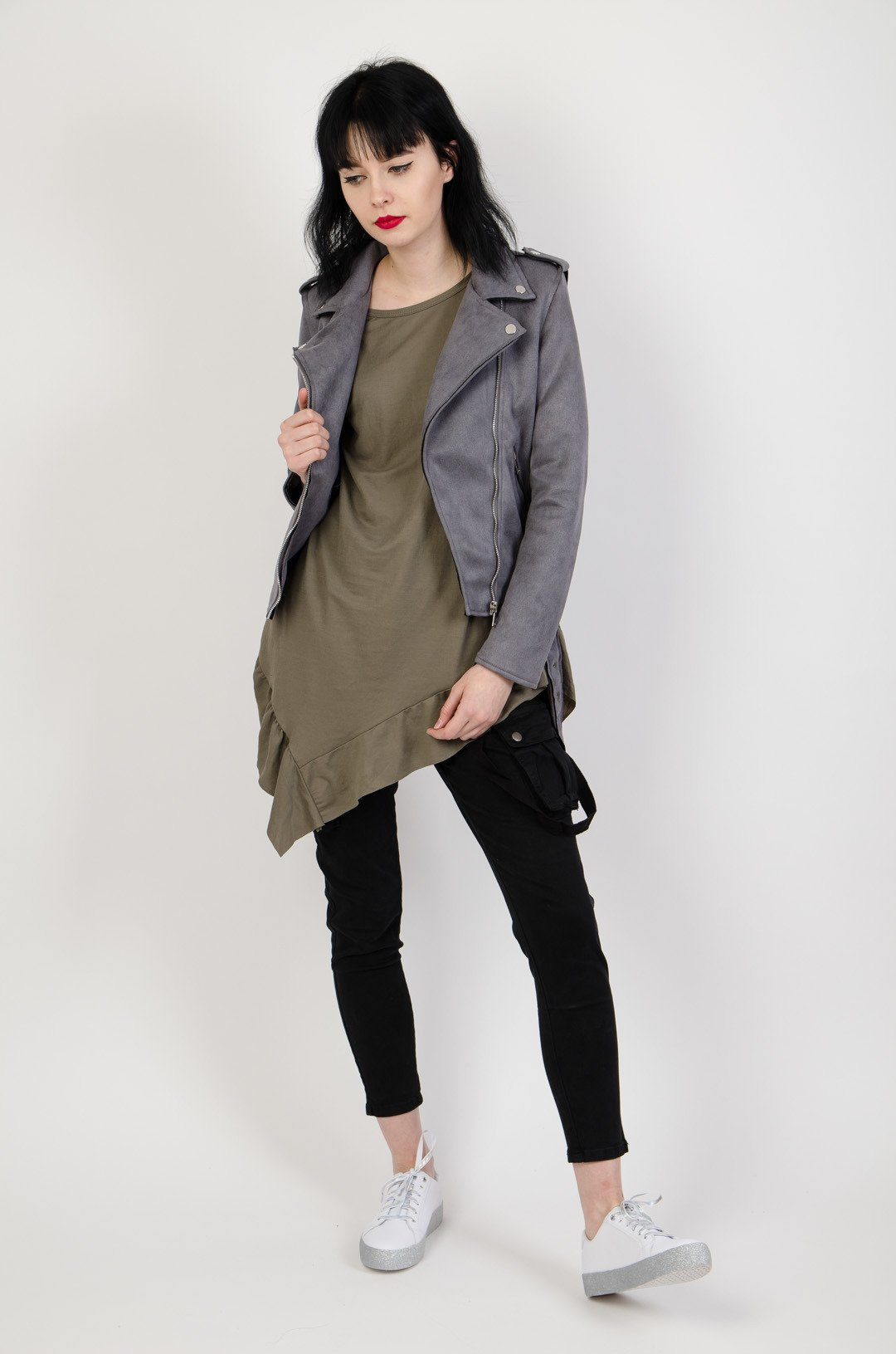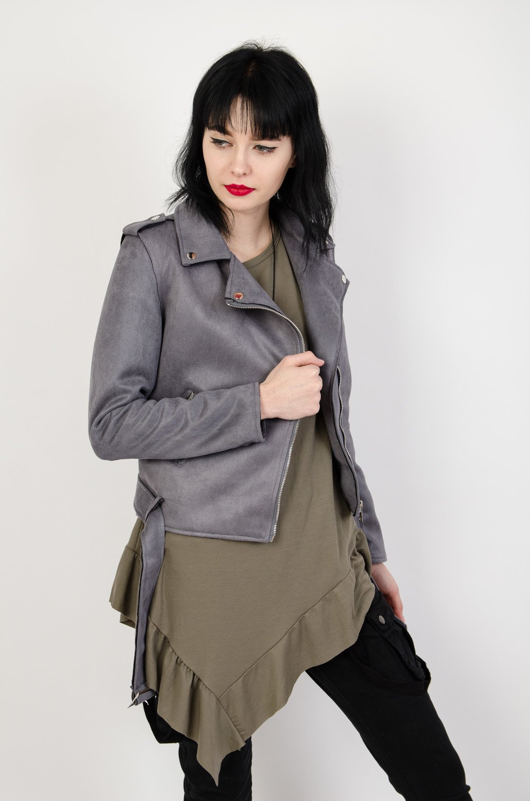 Szara zamszowa kurtka z paskiem na dole oraz srebrnymi zamkami.