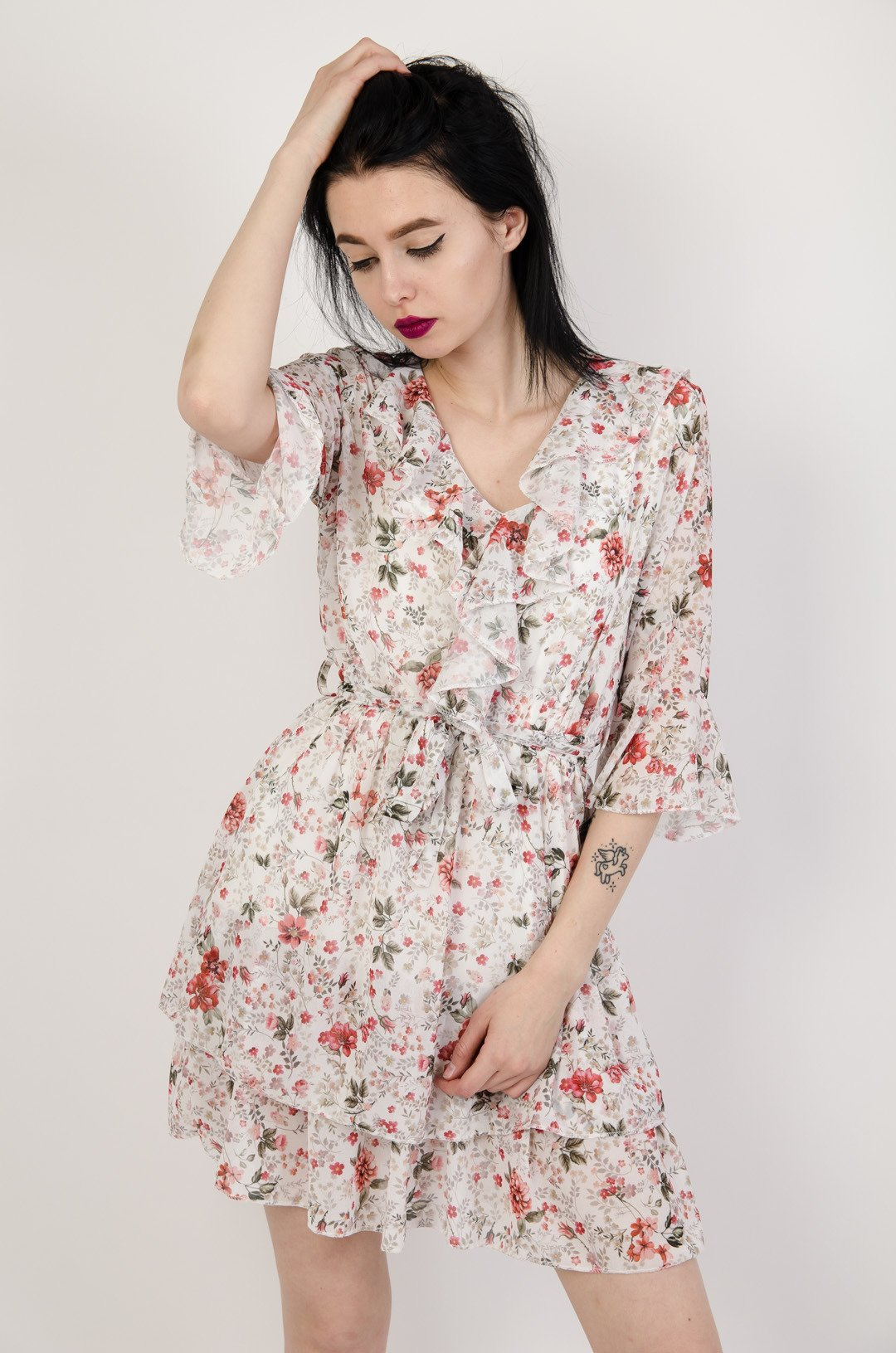 Biała zwiewna sukienka w drobny kwiatowy wzór z falbanami