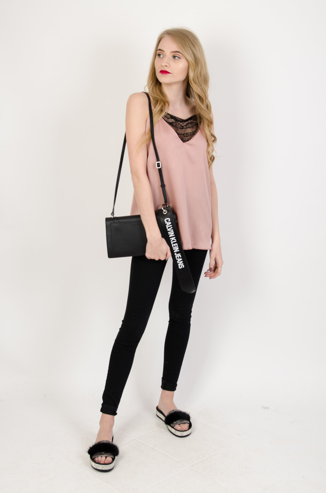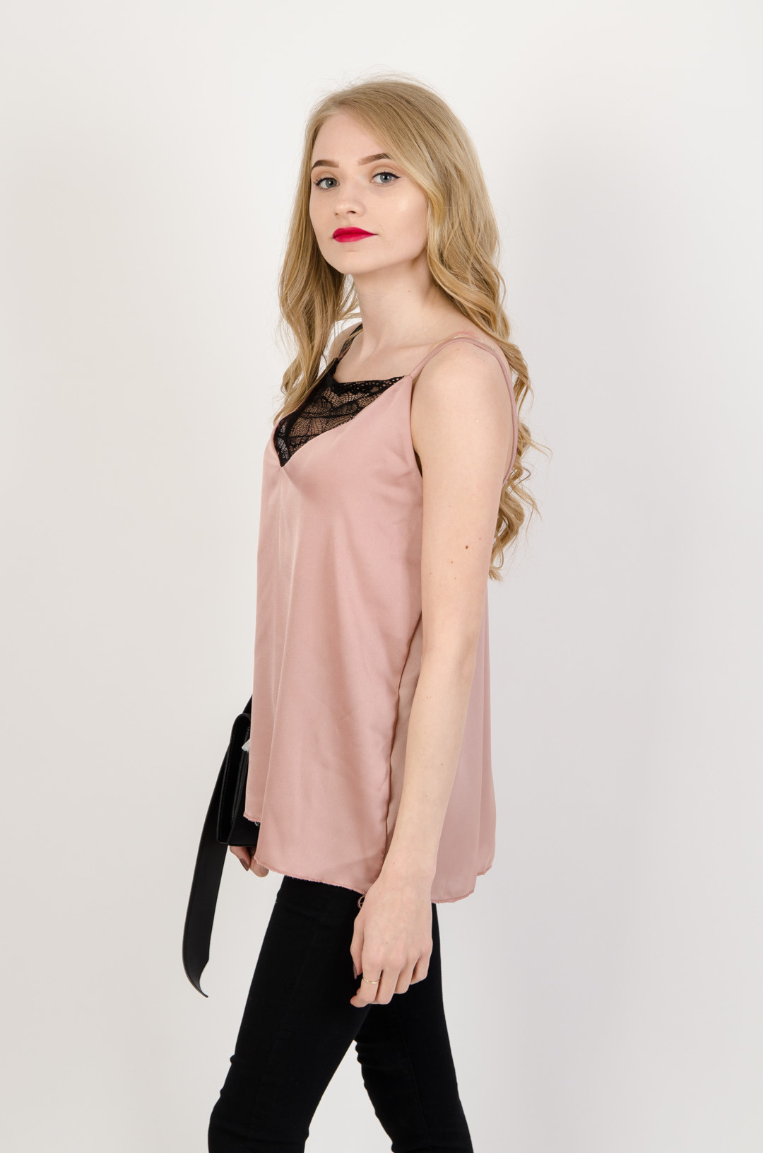 Różowa bluzka satynowa na cienkich ramiączkach z koronką w dekolcie