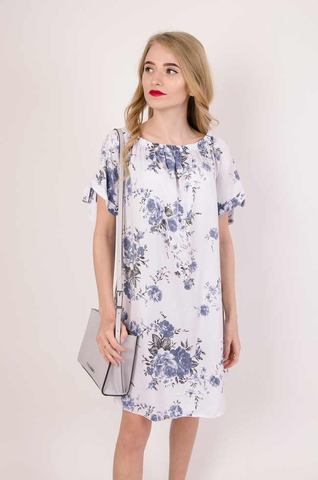 Biała tunika w niebieskie kwiaty z wiązanymi rękawami