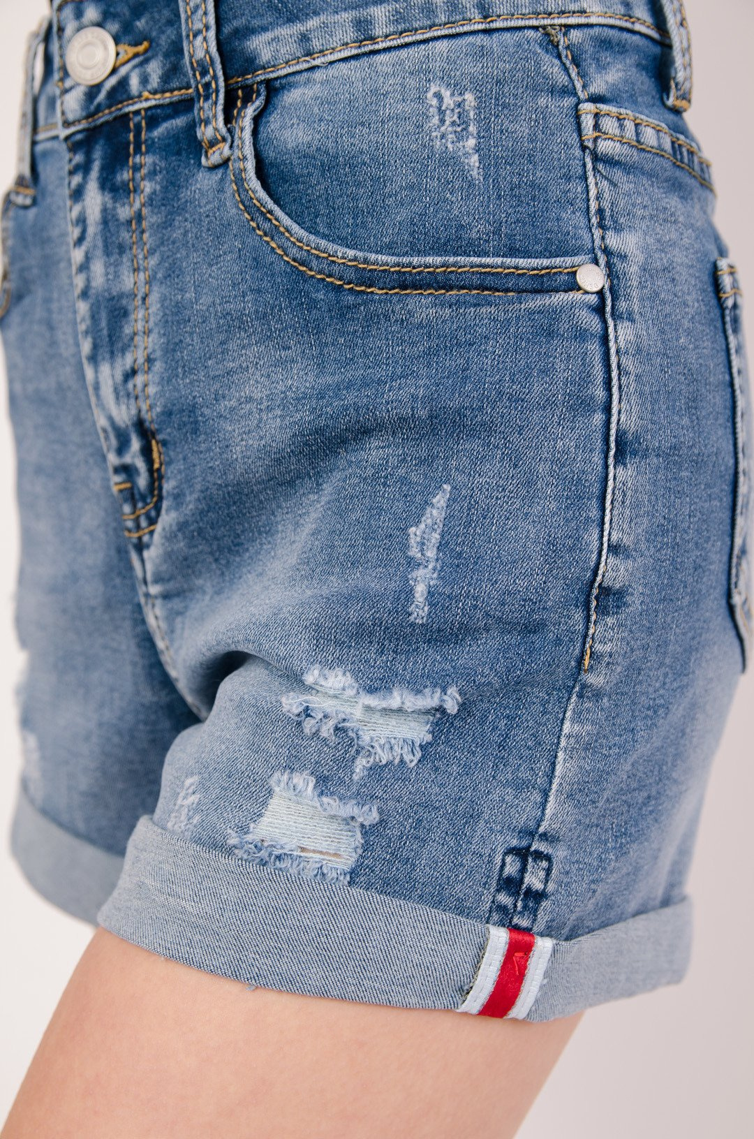 Jeansowe spodenki z przetarciami oraz czerwonym lampasem