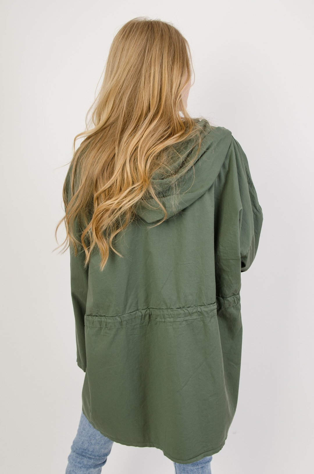 Zielona narzuta z kieszeniami i ściągaczem w pasie