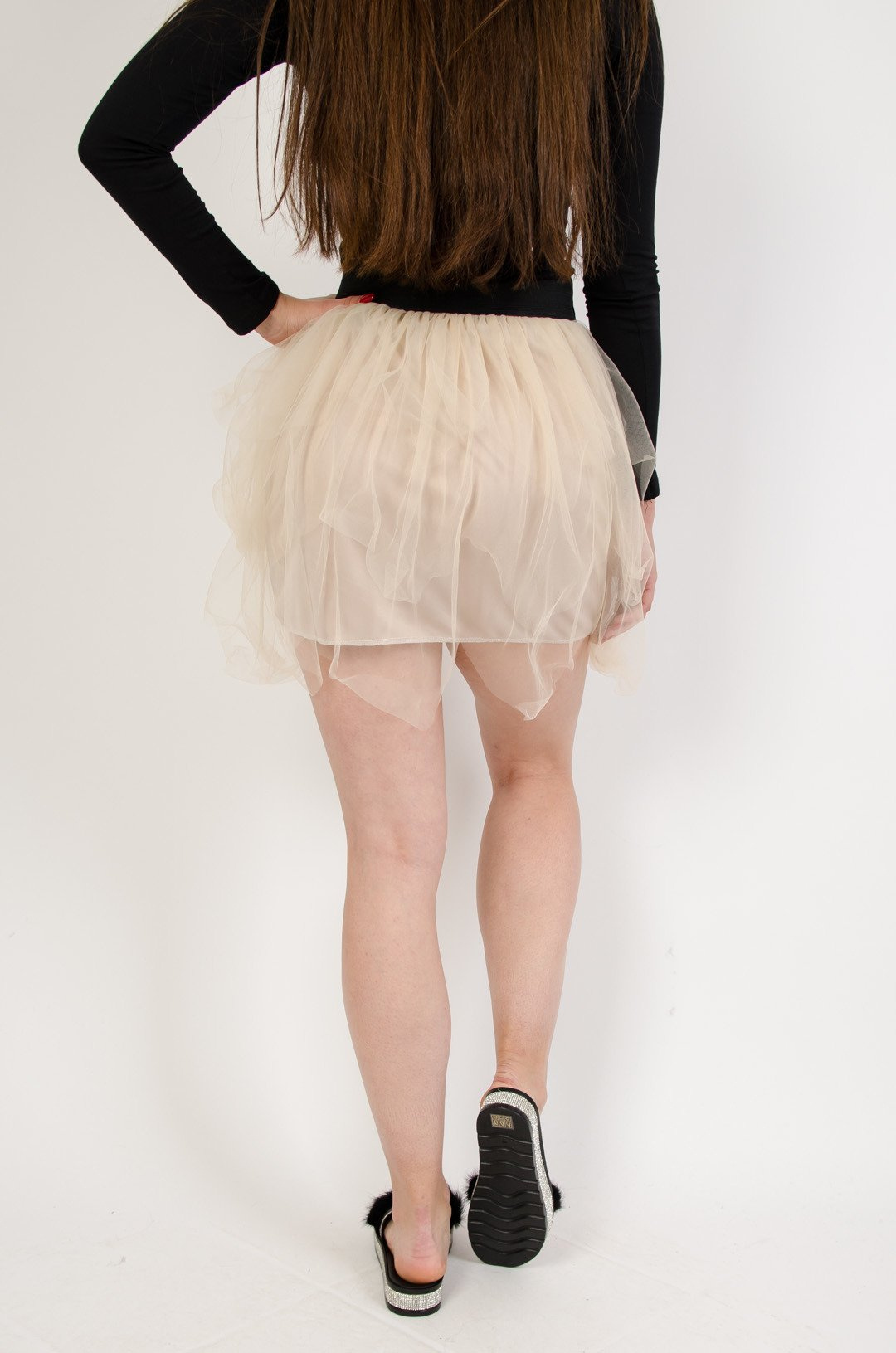 Beżowa tiulowa spódnica z czarną gumą w pasie