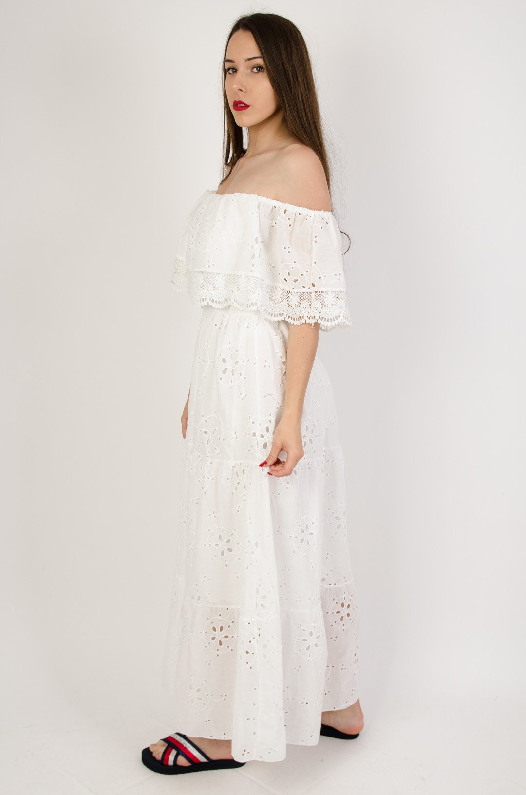 Biała długa ażurowa sukienka z hiszpańskim dekoltem zakończonym koronką
