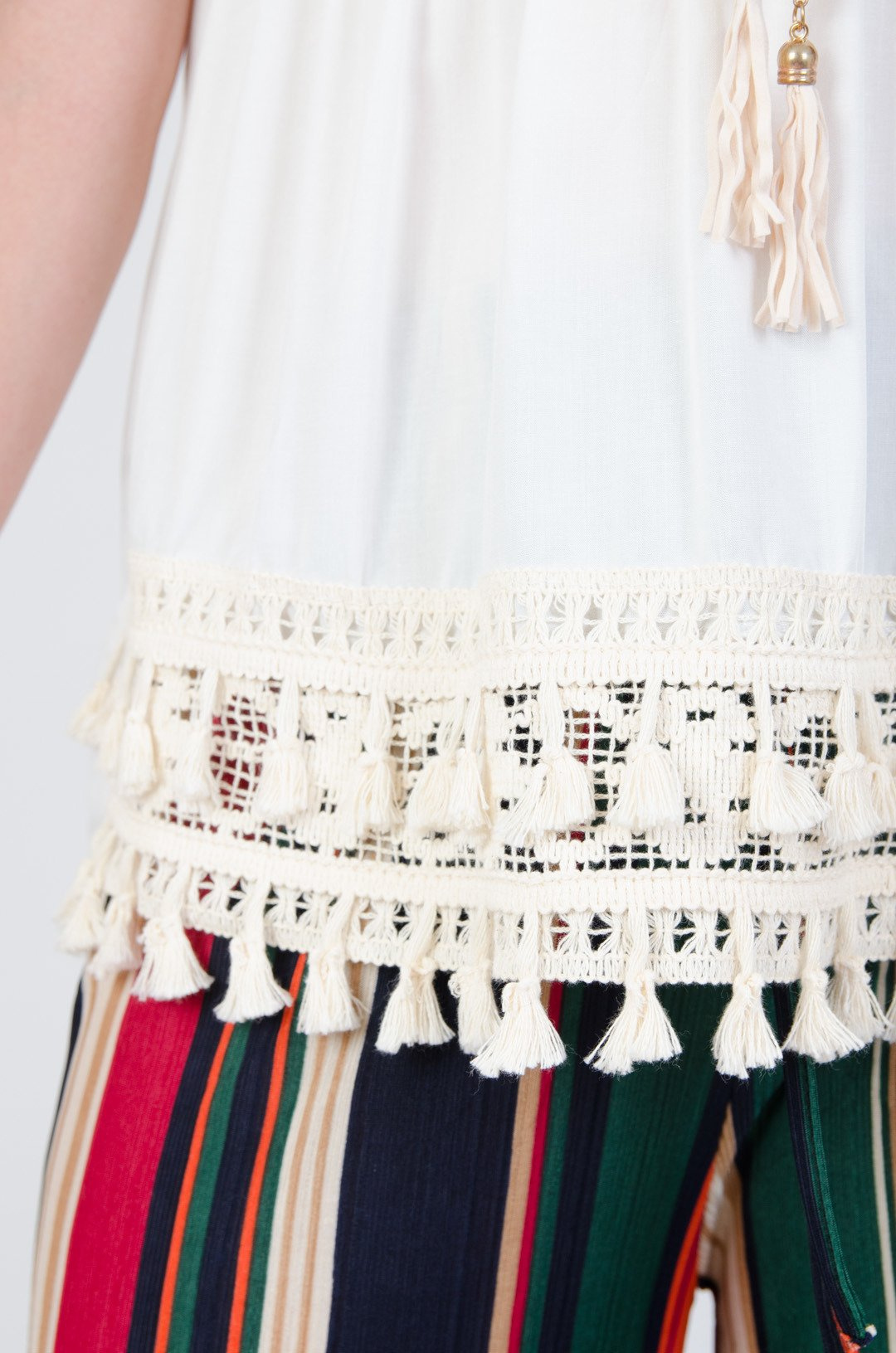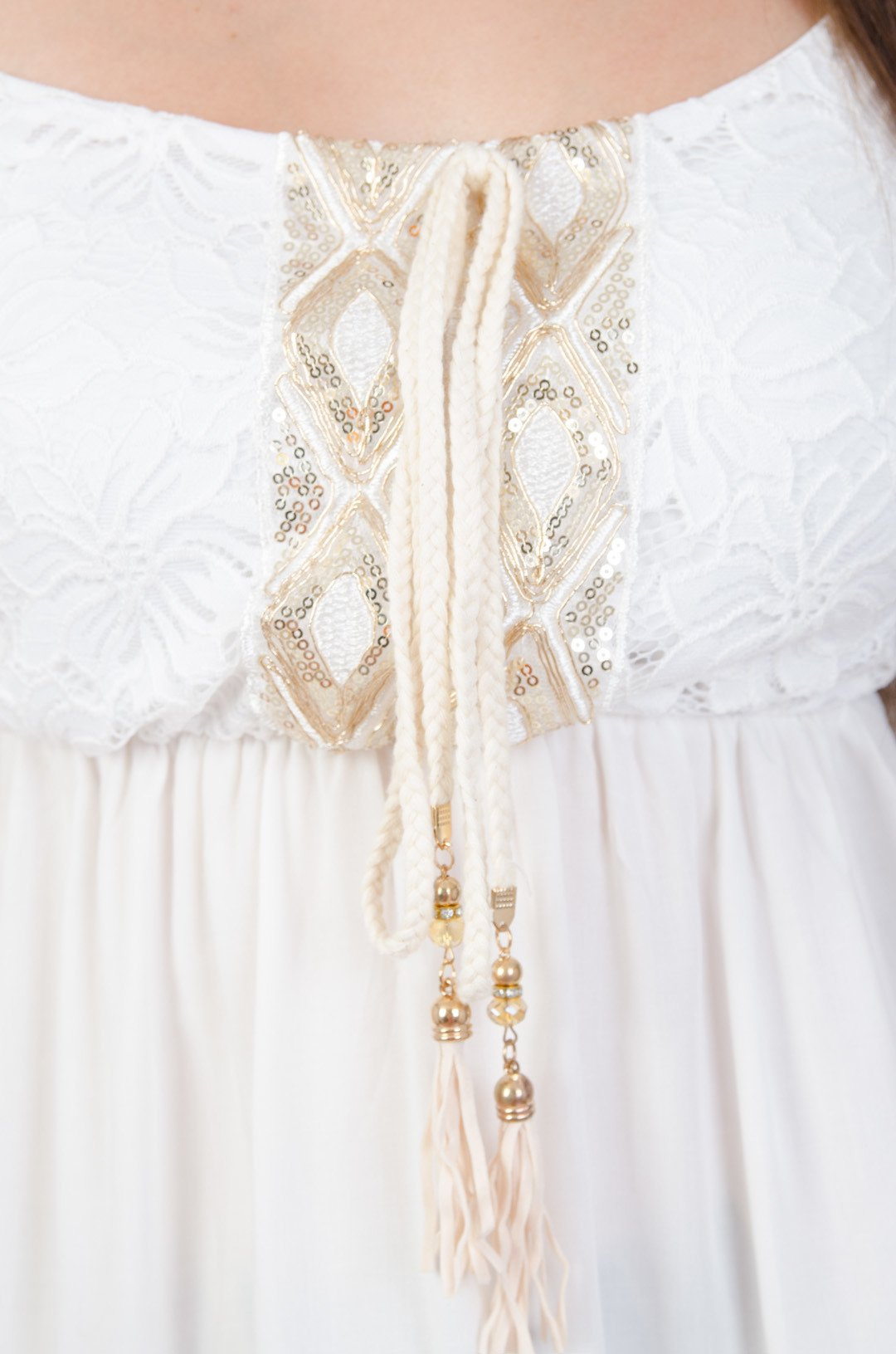 Biała bluzka z ażurowym dekoltem i złotymi cekinami
